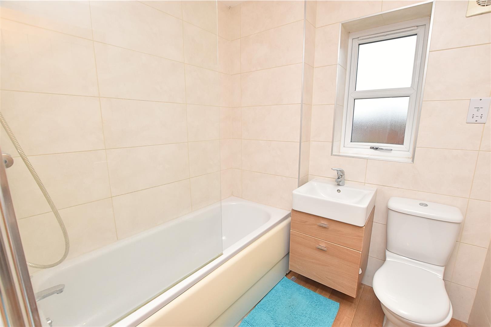 Fitted with a suite in white comprising a panelled bath having a shower and glass screen above, a vanity unit and a low flush wc. Fully tiled walls. Vinyl flooring. Heated towel rail. Double glazed window.