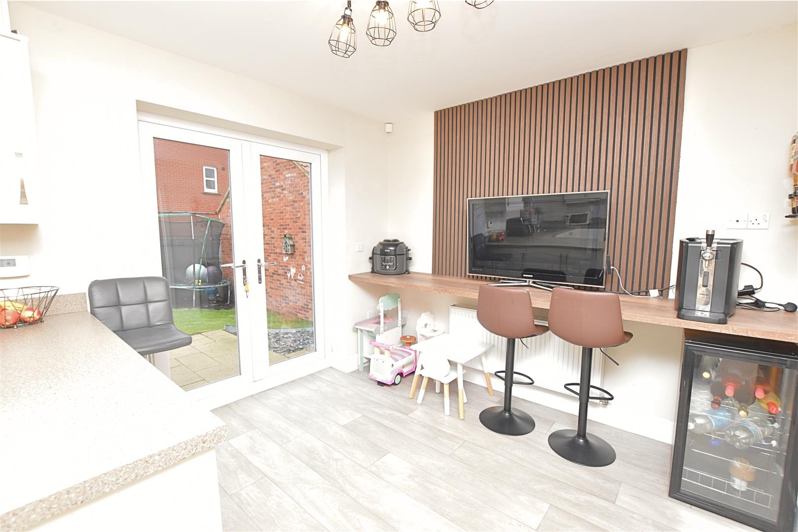 Fitted with an excellent range of cream high gloss base and wall cupboards including a built in electric oven, hob with an extractor fan above together with an integrated dishwasher, fridge and freezer. The contrasting work surfaces have space beneath for washing machine which extends to form a useful divide between the kitchen and the dining areas. Fitted breakfast bar area having acoustic wall panelling above. Vinyl flooring. Inset spot lights to ceiling. Radiator. Double glazed window plus double glazed french doors which opens onto the rear garden. The Potterton gas fired boiler is concealed in a matching wall cupboard.