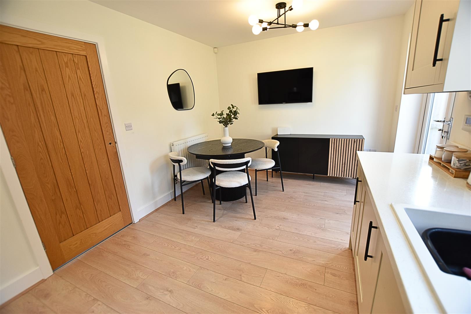 The modern kitchen diner benefits from a large range of shaker style wall and base units in a modern tone with black handles, contrasting worksurfaces with matching up stands incorporating a composite sink and drainer, gas hob with glass splashback and black chimney style extractor hood above, electric fan assisted oven beneath. Integrated appliance include fridge freezer, dishwasher and automatic washing machine. Wall mounted boiler in matching wall unit. Finished with down lights to the ceiling, wood effect laminate flooring, radiator and uPVC double glazed window and French doors over looking the garden. Ample room for a family dining table.