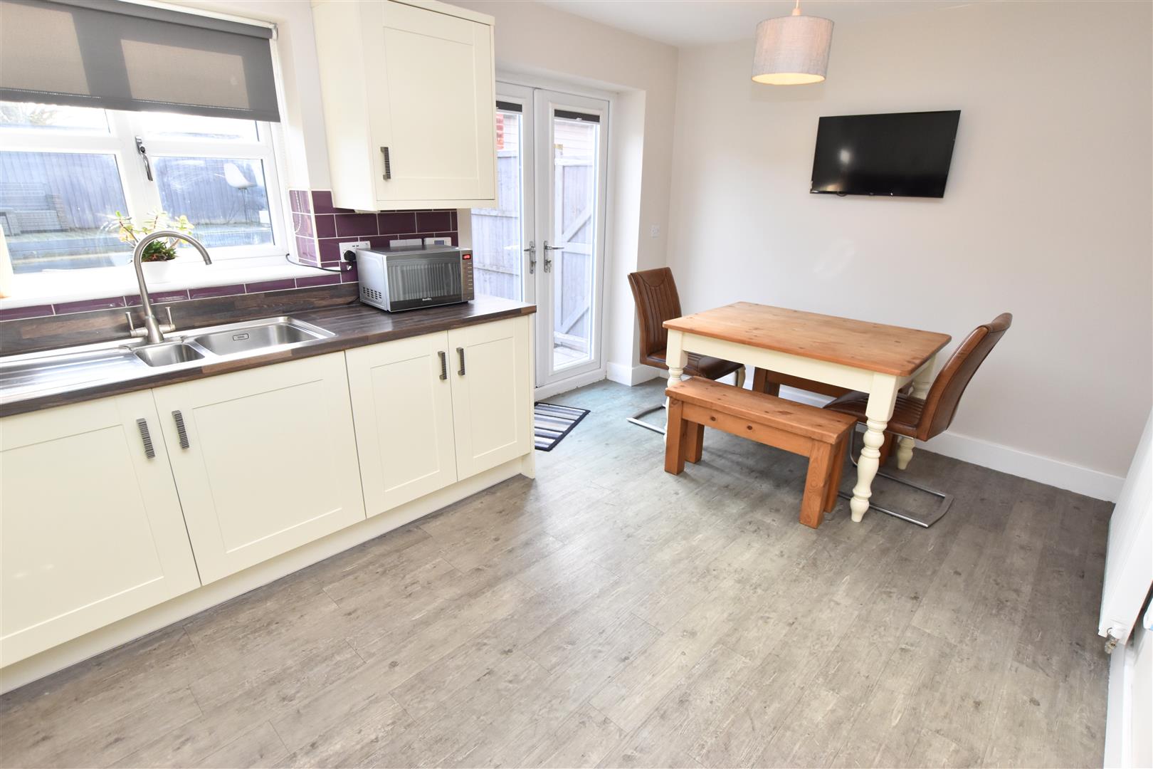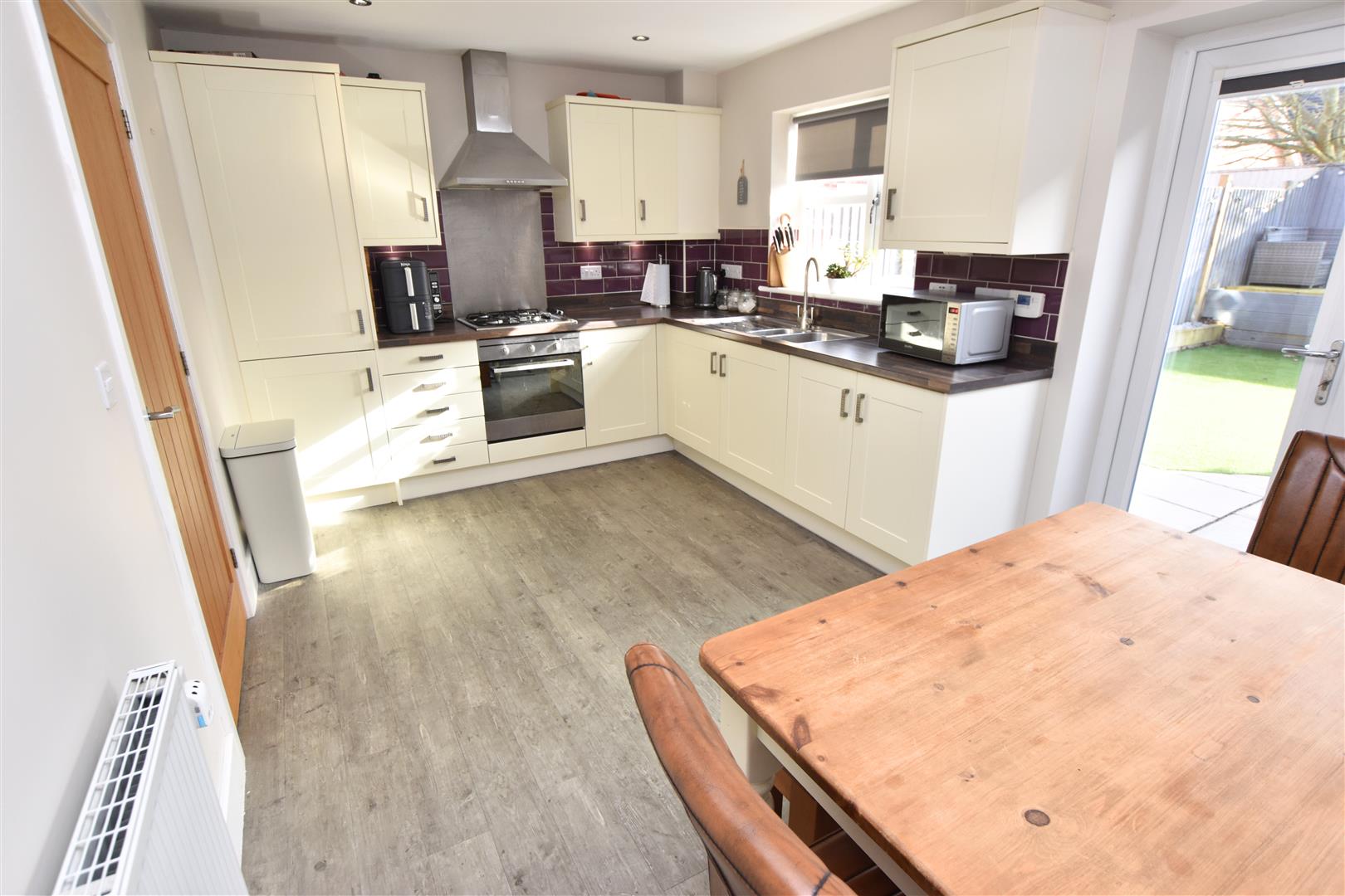 The kitchen benefits from a range of cream fronted wall and base units with contrasting worksurfaces and matching upstands incorporating a stainless steel sink and drainer, gas hob with stainless steel splashback and chimney style extractor hood above with electric fan assisted oven beneath, integrated fridge freezer and automatic washing machine. Finished with down lights to the ceiling, wood effect laminate flooring, radiator, uPVC double glazed window and French doors overlooking the garden. Ample room for a family dining table.