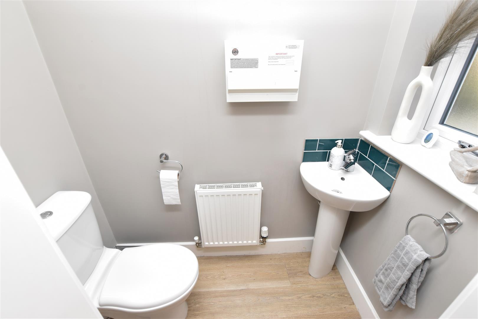 The handy cloakroom benefits from a white two piece suite comprising of; Low flush wc and pedestal hand wash basin with tiled splashbacks. Finished with wood effect laminate flooring, radiator, extractor fan and a uPVC double glazed window to the front aspect.