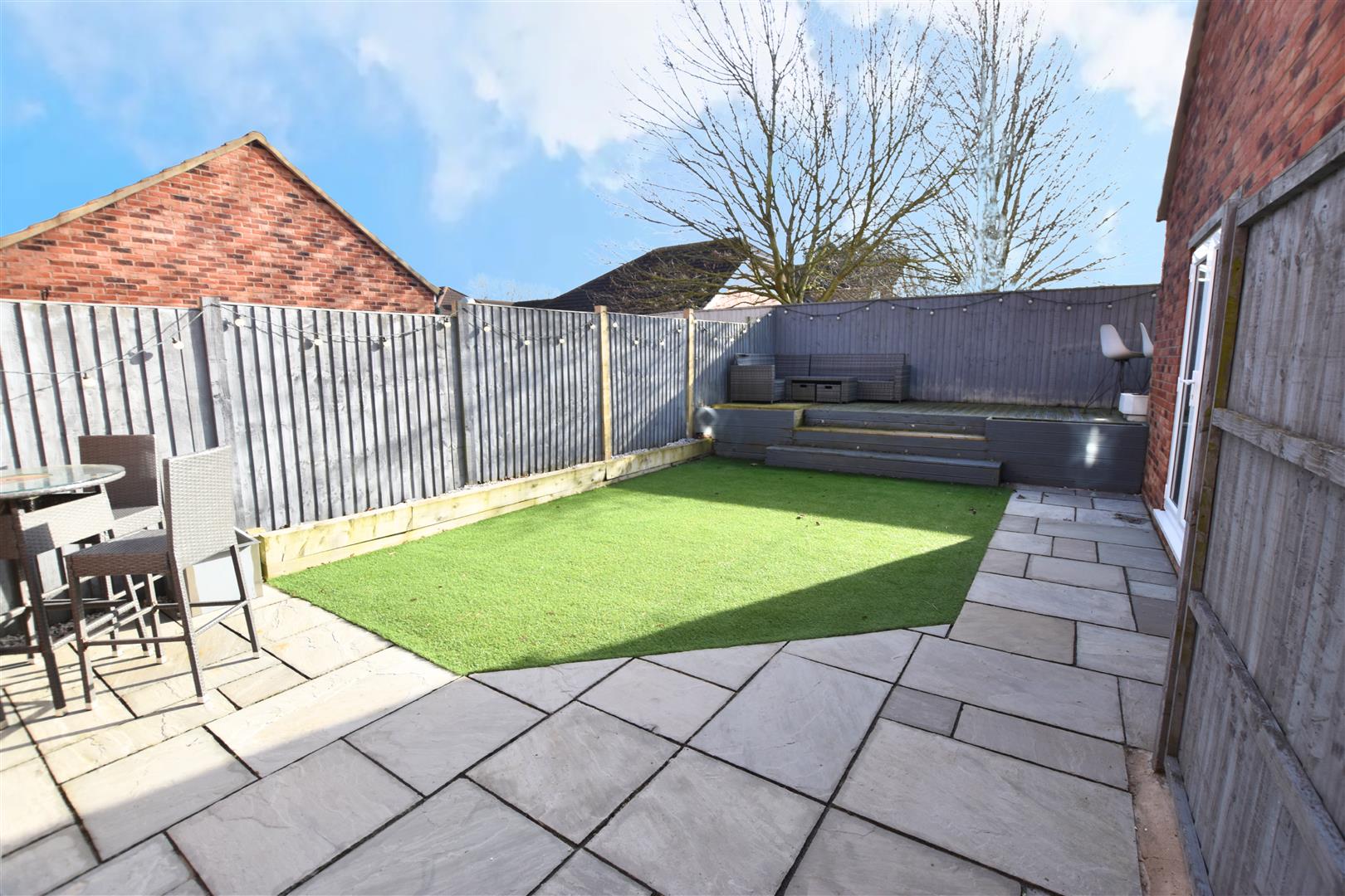The property sits with in a cul de sac and enjoys and open plan front garden laid with slate, red brick driveway ideal for off road parking of several vehicle. Side fencing and wooden gate leading to the rear garden. The southerly facing rear garden has fenced boundaries and is laid artificial grass with a paved patio leading from the property and a rear raised decked patio area finished with raised feature sleeper planting beds.