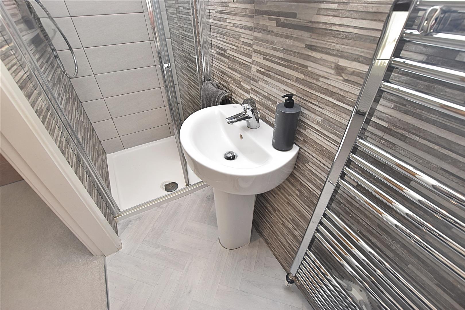 Benefitting from a white three piece suite comprising of; Walk in shower with glazed screen and tiled splashback, pedestal hand wash basin and low flush wc. Finished modern tiling to the walls, Herringbone style vinyl flooring, heated towel rail, down lights, extractor fan and shaver point.