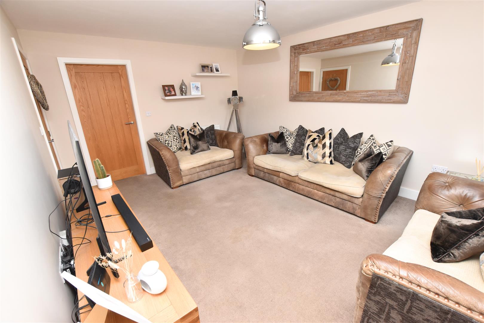 The welcoming hallway has wood effect laminate flooring, radiator and carpeted stairs leading to the first floor. Oak connecting doors leading to the further accommodation.