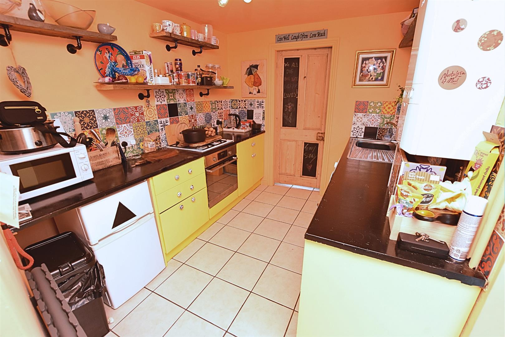 The kitchen benefits from a range of hand painted base units with contrasting work surfaces and decorative tiled splash backs and incorporates a stainless steel sink and drainer, gas hob with electric fan assisted oven beneath and ample space for further appliances. Finished with tiled flooring, modern shelving, wall mounted boiler and uPVC double glazed window and side access door over looking the garden.