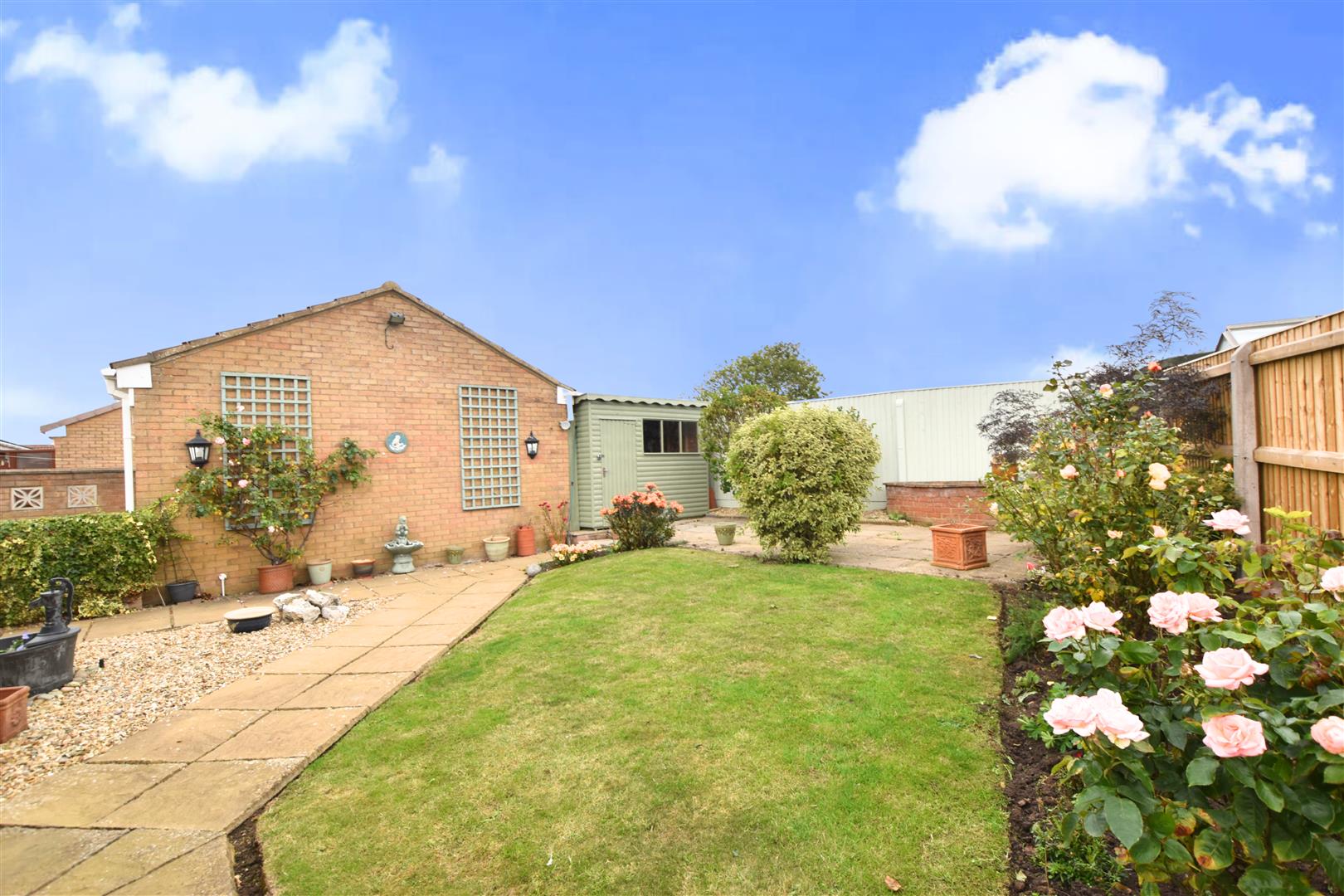 The bungalow stands on an extra wide plot having an extra parcel of land to the right hand side which with the necessary planning permission for a dropped kerb would provide additional off road parking. This garden is gravelled for ease of maintenance inset with established bushes and shrubbery. The paved driveway leads to the garage and the enclosed rear garden which contains paved areas together with a small lawn edged with borders of rose bushes. Included in the sale timber garden shed.