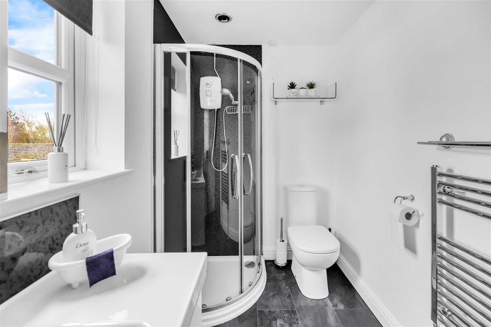 The en suite shower room benefits from a white three piece suite comprising of; Corner shower with glazed screens, electric shower and Aqua panelled splashbacks, low flush wc and floating vanity unit with hand wash basin and handy storage draws. Finished with tiled effect laminate flooring, heated towel rail and uPVC double glazed windows to the rear aspect.