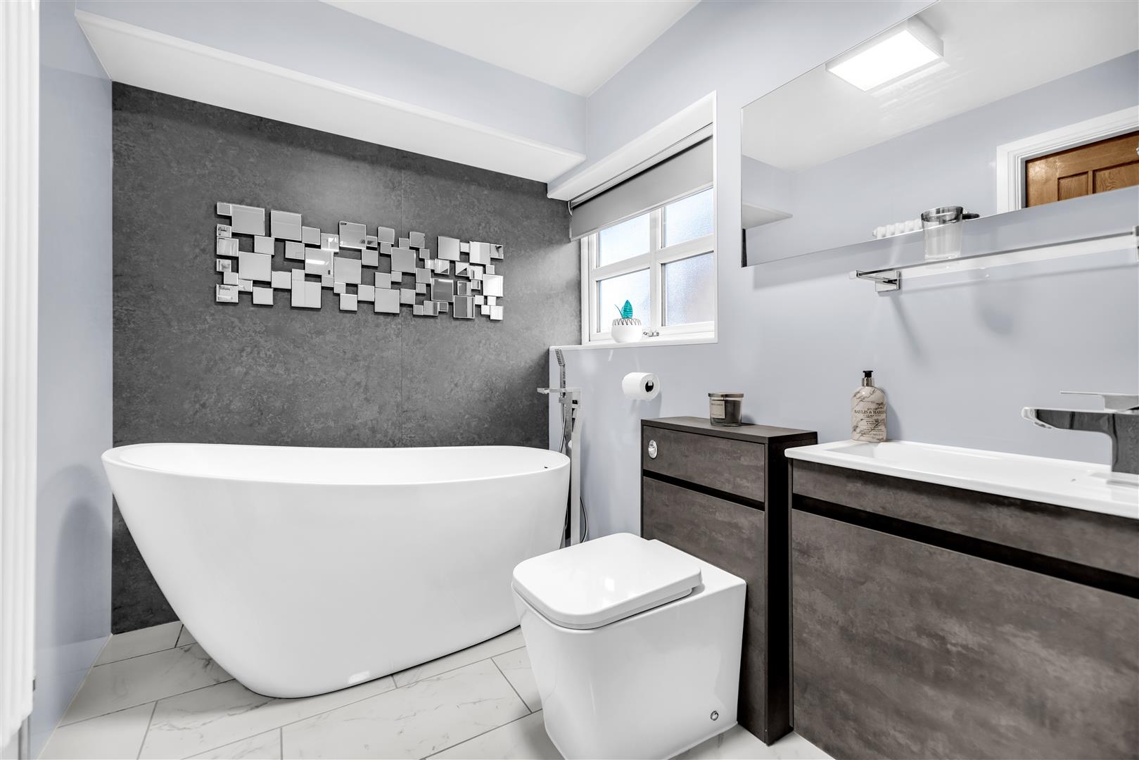 The modern family bathroom has been recently refurbished to include a white four piece suit with freestanding tear shaped bath having floor tap and hand shower, wall to wall walk in shower with rainfall head and dual hand shower and glazed screens, floating hand wash vanity unit with handy storage and low flush wc with hidden cistern in matching unit. Finished with Aqua panelled wall and a feature gray wall, tiled flooring, heated towel rail, extractor and uPVC double glazed window to the side aspect.