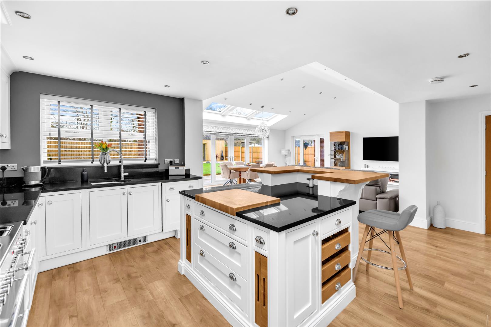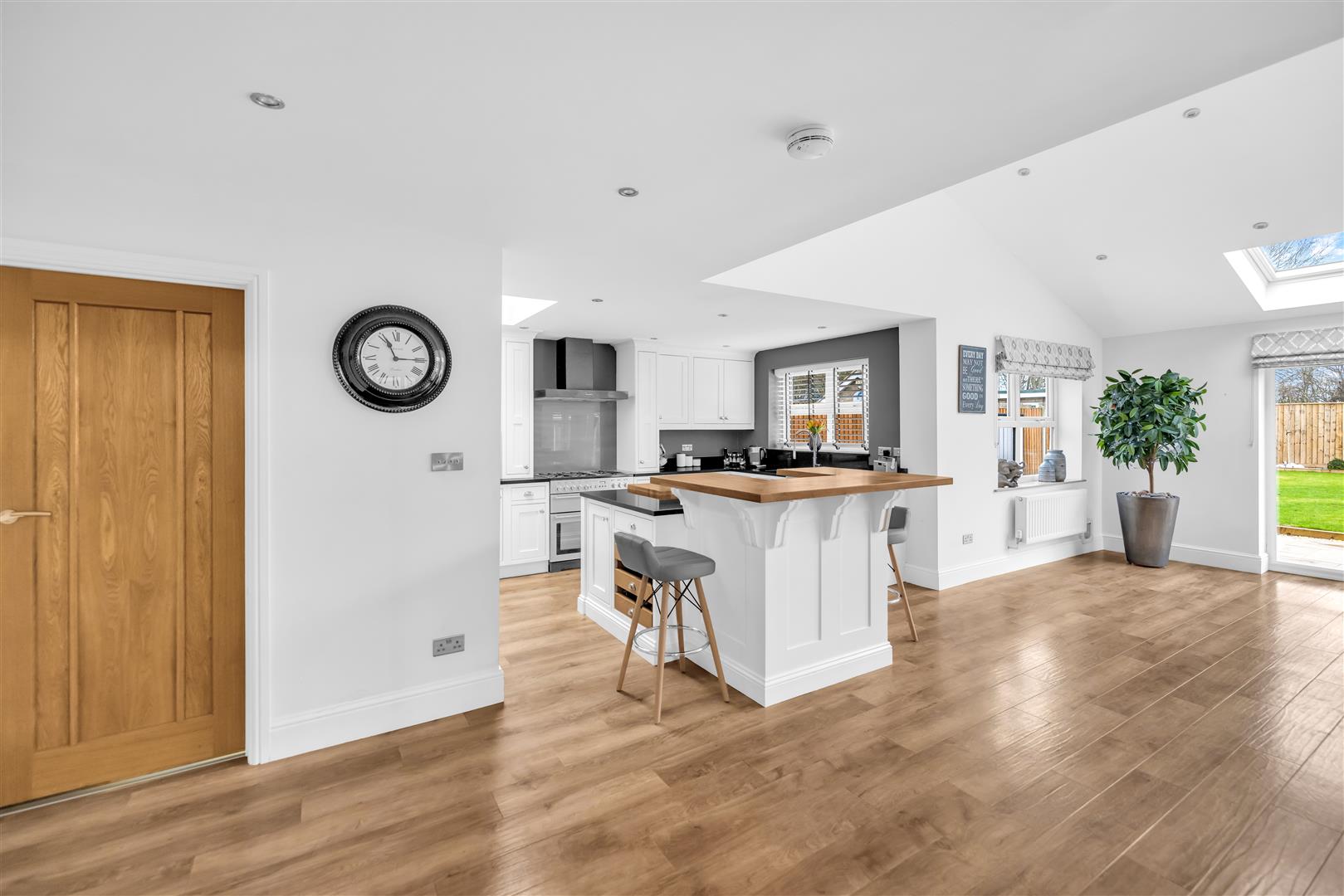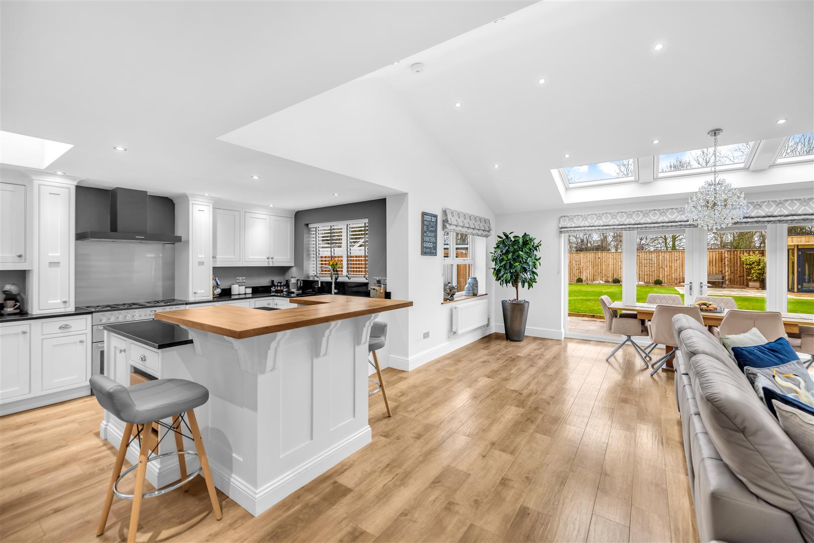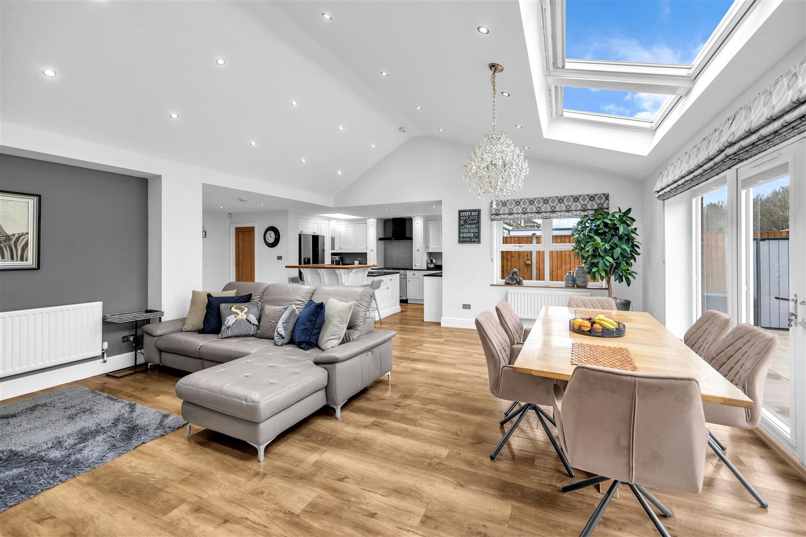 The true hub of the home tastefully designed and extended by the current vendors with ample natural light from the three Velux roof windows, further Velux to the kitchen area, dual aspect uPVC double glazed doors with side light panels and two window to the side aspect. The kitchen is a Traditional joinery kitchen with cashmere coloured wall and base units Granite work surfaces and matching upstands incorporating a range cooker with glass splashback and black chimney style extractor hood, inset ceramic sink, integrated dishwasher and American fridge freezer. Having a focal pinnacular island which has ample further storage, granite worksurface and doubles as a breakfast bar. This open plan room has ample space for a large family dining table and lounge area with modern wall mounted electric fire. Finished with down lights to the ceiling, wood effect Karndean flooring and three radiators. A truly exceptional family living area.
