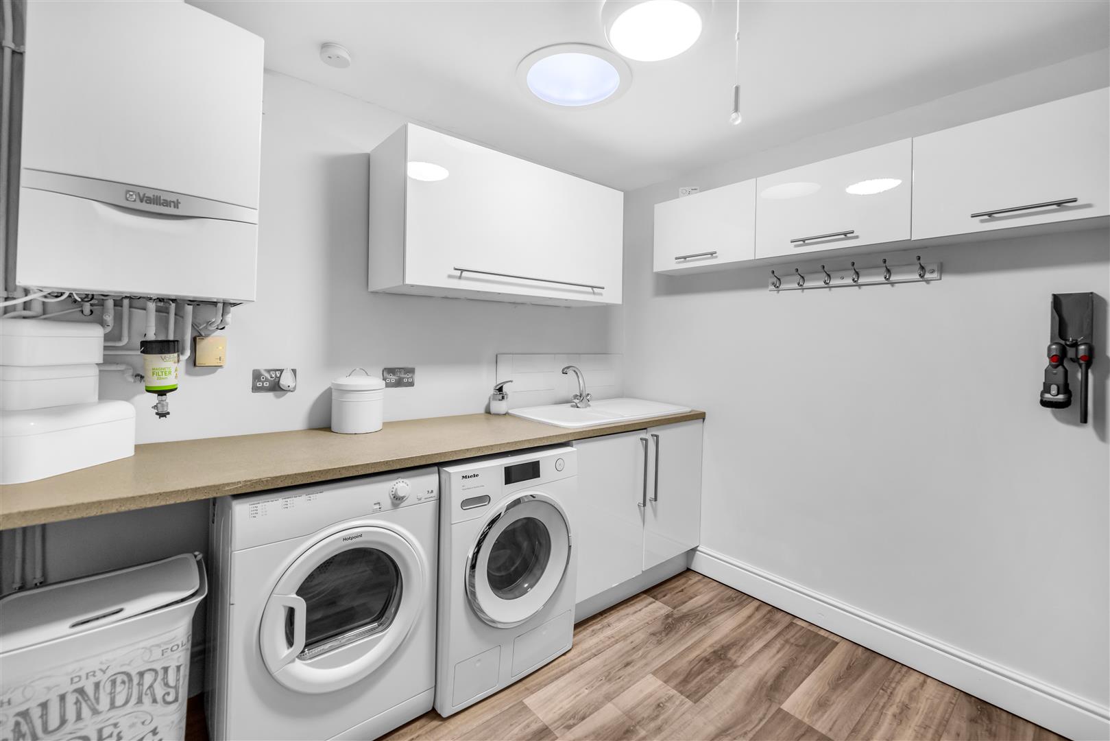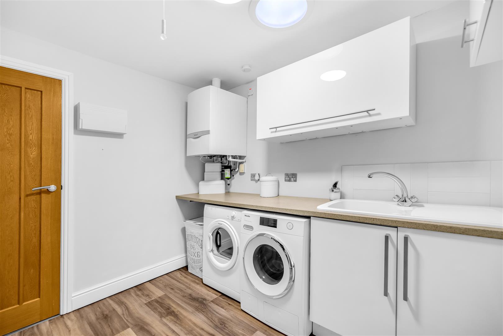 The handy utility rom benefits from a range of cream gloss wall and base units with contrasting worksurfaces incorporating a ceramic sink and drainer, plumbing for an automatic washing machine, space for a tumble dryer and wall mounted boiler. Finished with a sky light tunnel, wood effect vinyl flooring, cloaks area and dual Oak doors one to the snooker room and one to the living kitchen diner.