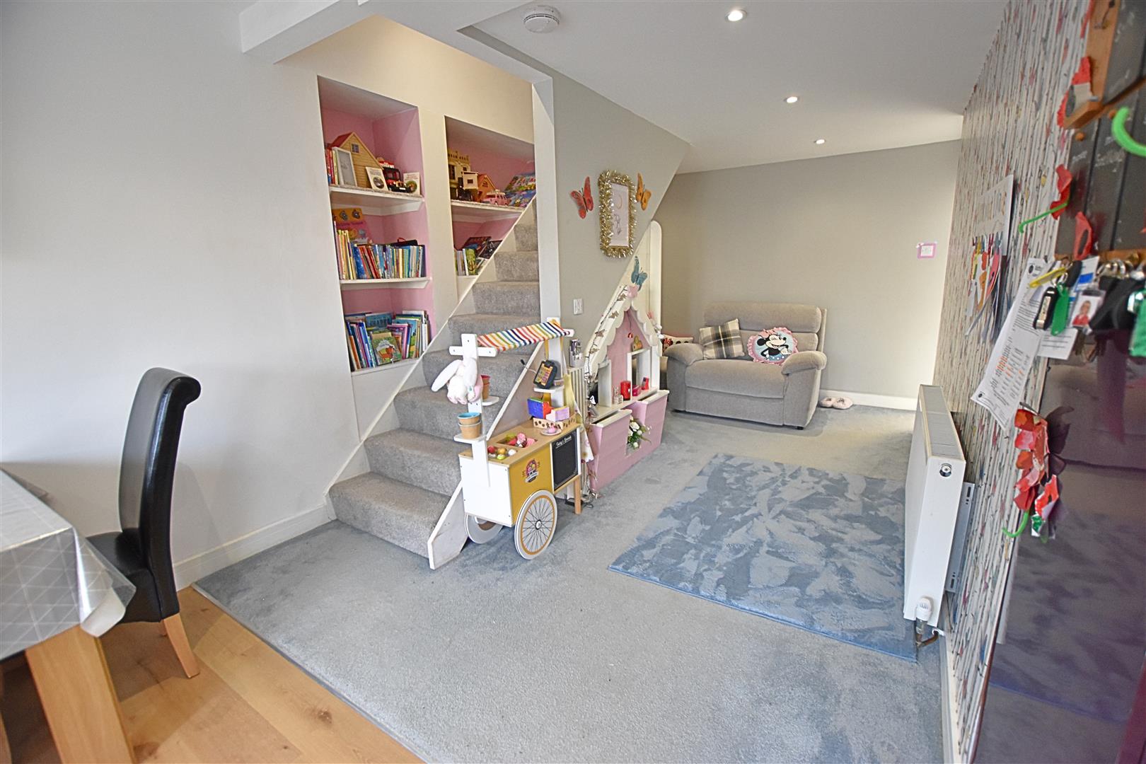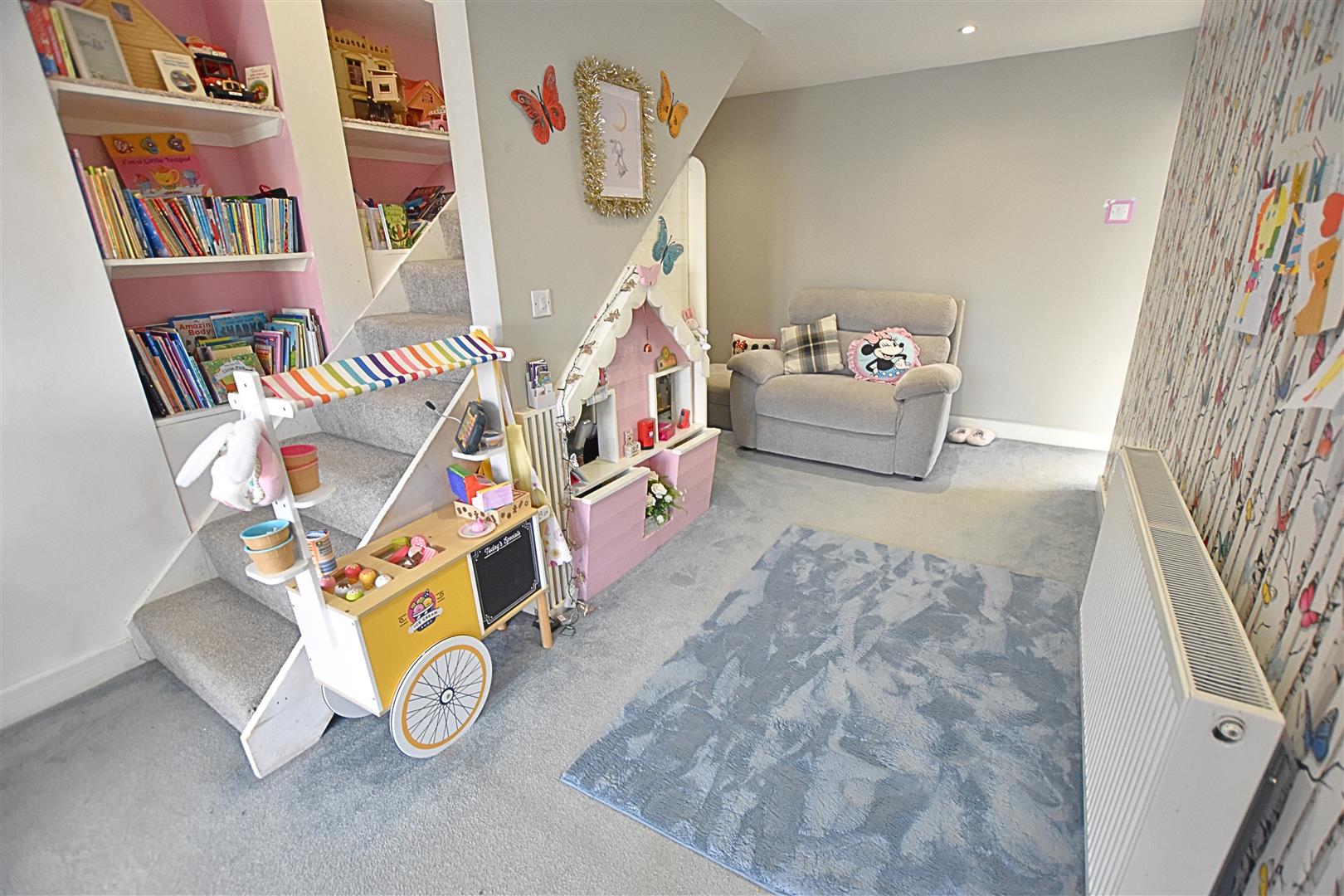 The handy snug reading area is open plan to the kitchen diner and has been adapted by the current vendors to create a fabulous reading/play area for the children with a feature wendy house built into the stair well, finished with down lights to the ceiling, carpeted flooring, radiator and carpeted stairs with built in shelving leading up the stairs ideal for books.