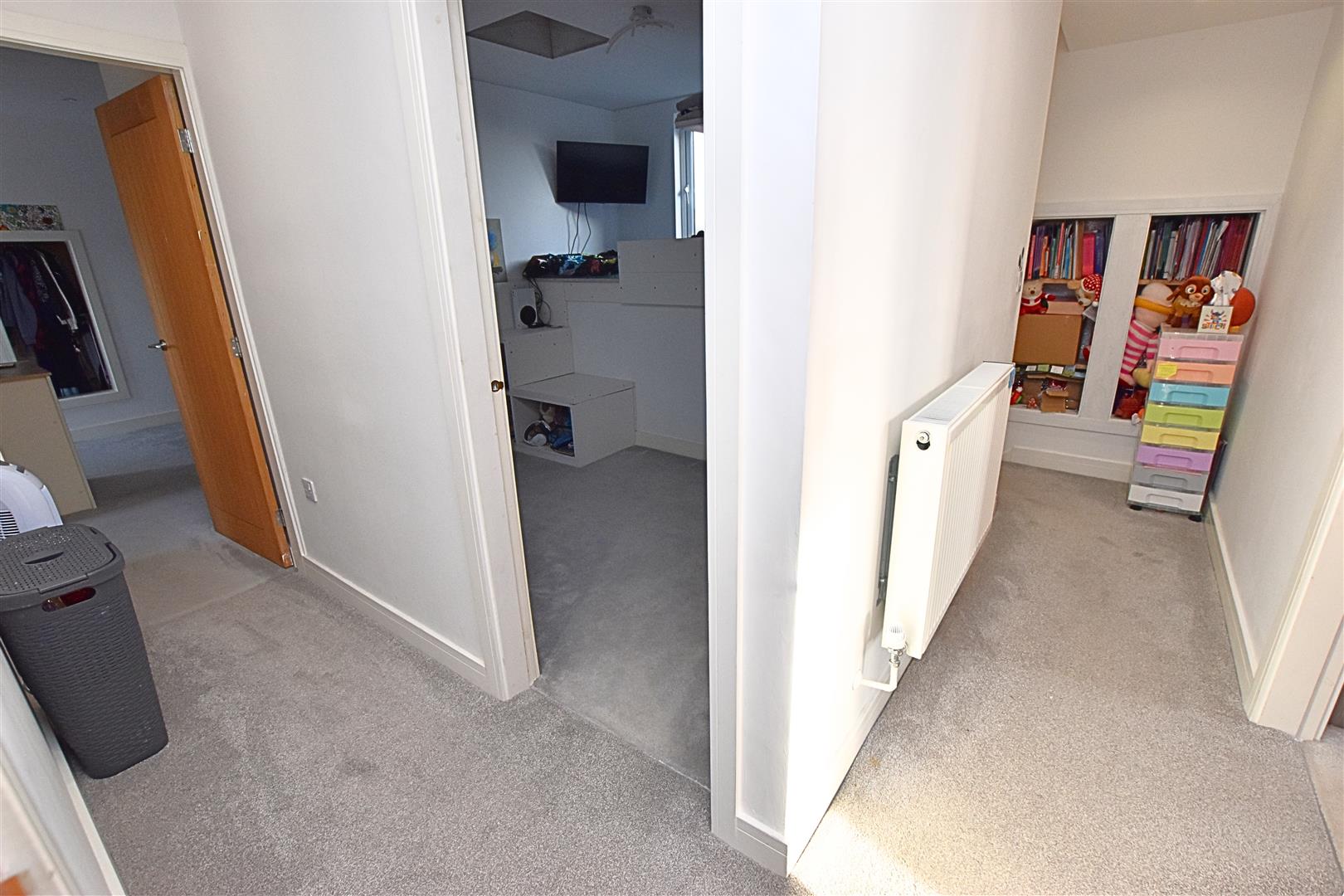 The landing has continued carpeted flooring, down lights to the ceiling, handy open storage shelves and radiator. Oak connecting doors to the further bedrooms and bathroom.
