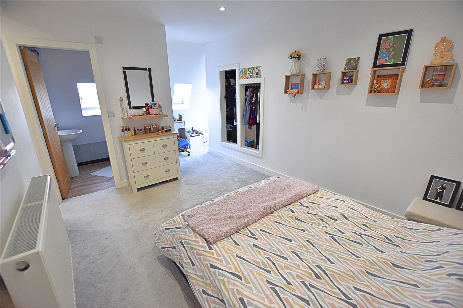 The master bedroom has a Velux style window and feature triangle light window and is finished with carpeted flooring, radiator and built in open storage wardrobe with shelving.