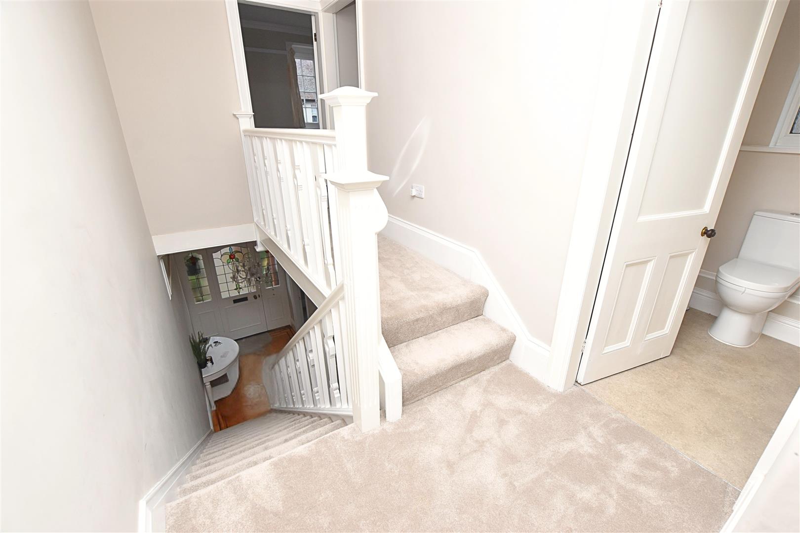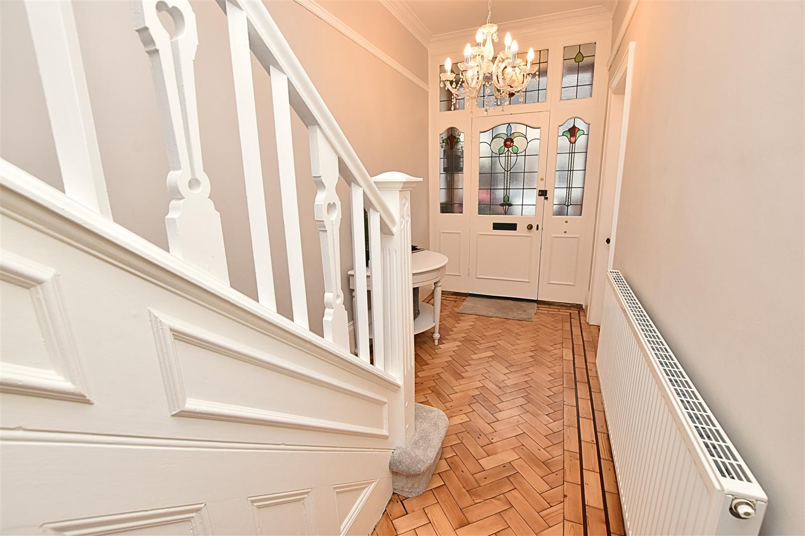 Setting the feel for the rest of the property with its high ceilings and skirting boards and original parquet flooring. Finished with coving, picture rail, radiator and carpeted stairs with open white wooden spindle balustrade and handy under stairs storage.