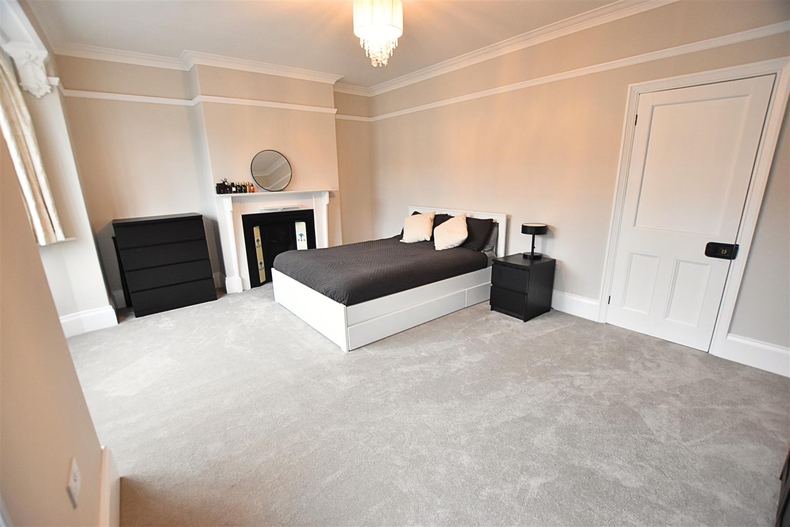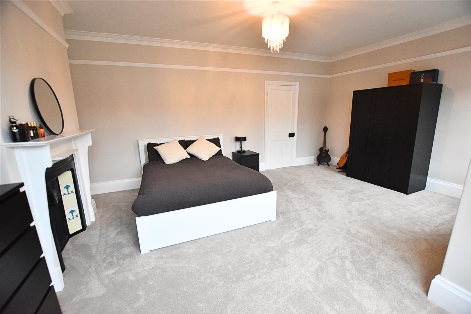 The master bedroom has two window to the front aspect open being a walk bay window, coving to the ceiling, picture rail, carpeted flooring, high skirting boards, radiator and feature white wooden fire surround with original style cast iron fire insert with tiled sides.