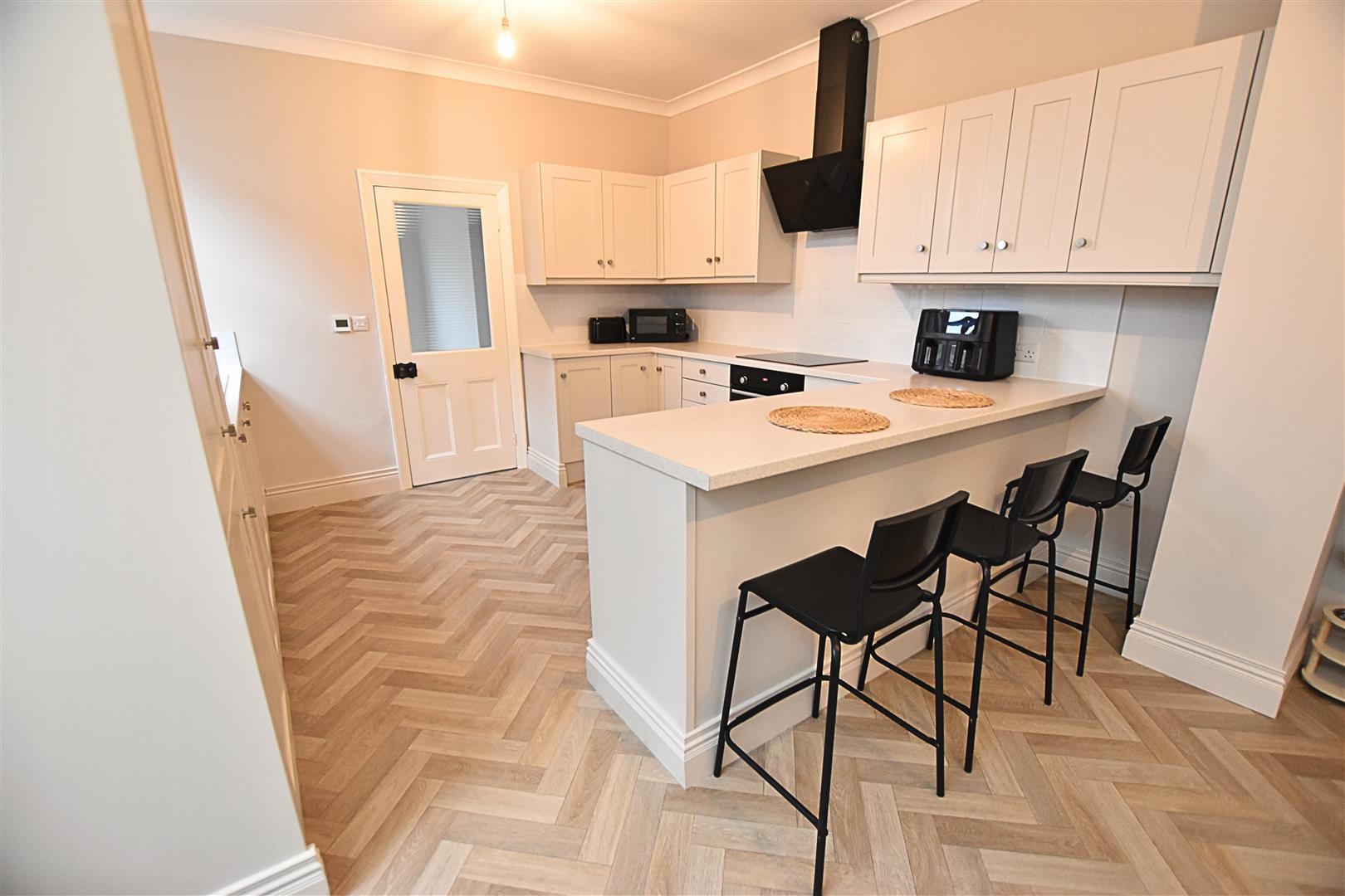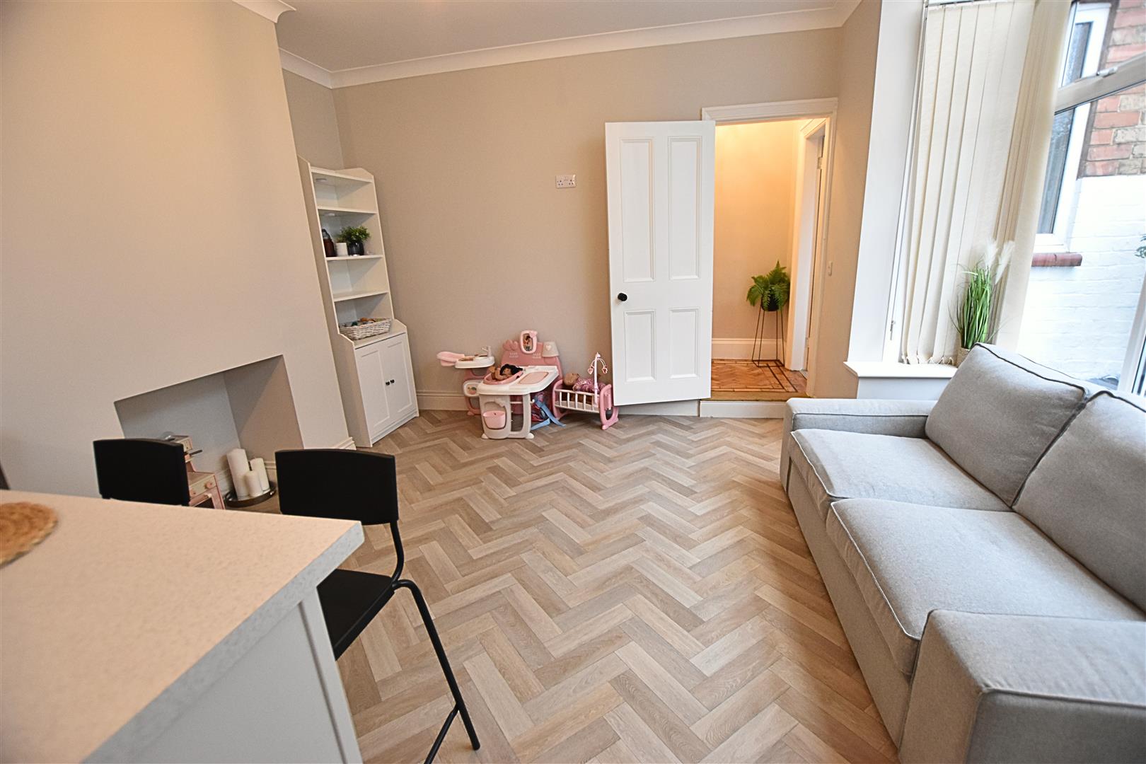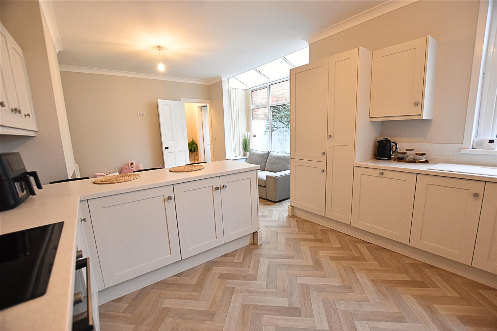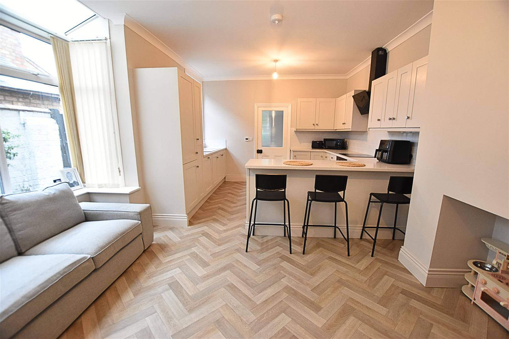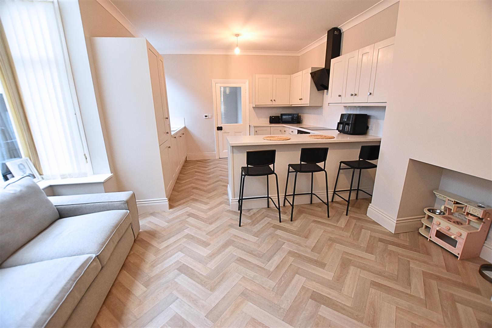 This fantastic family room provides ample space for a family seating arear and dining area and allows the children to play while you are overseeing dinner. The kitchen area benefits from a large range of Porcelain coloured shaker style wall and base units with contrasting work surfaces and tiled splashbacks. The work surface creates a handy breakfast bar. Incorporating a composite sink and drainer, ceramic hob with electric fan assisted oven beneath and black glass extractor hood above, integrated dishwasher and fridge freezer. Finished with coving to the ceiling, Herringbone style wood effect vinyl flooring, radiator, to the seating and dining area there is a uPVC double glazed square bay window with ceiling light windows, open chimney breast with Oak beam and a further uPVC double glazed window to the kitchen area.