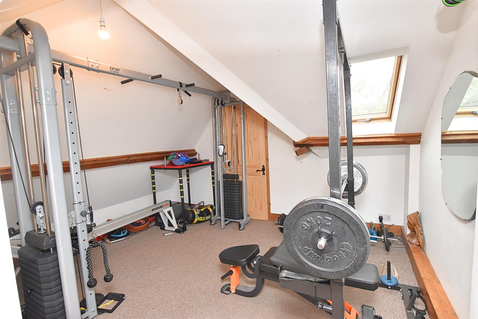 This spacious area includes seating and gym areas with two Velux windows.