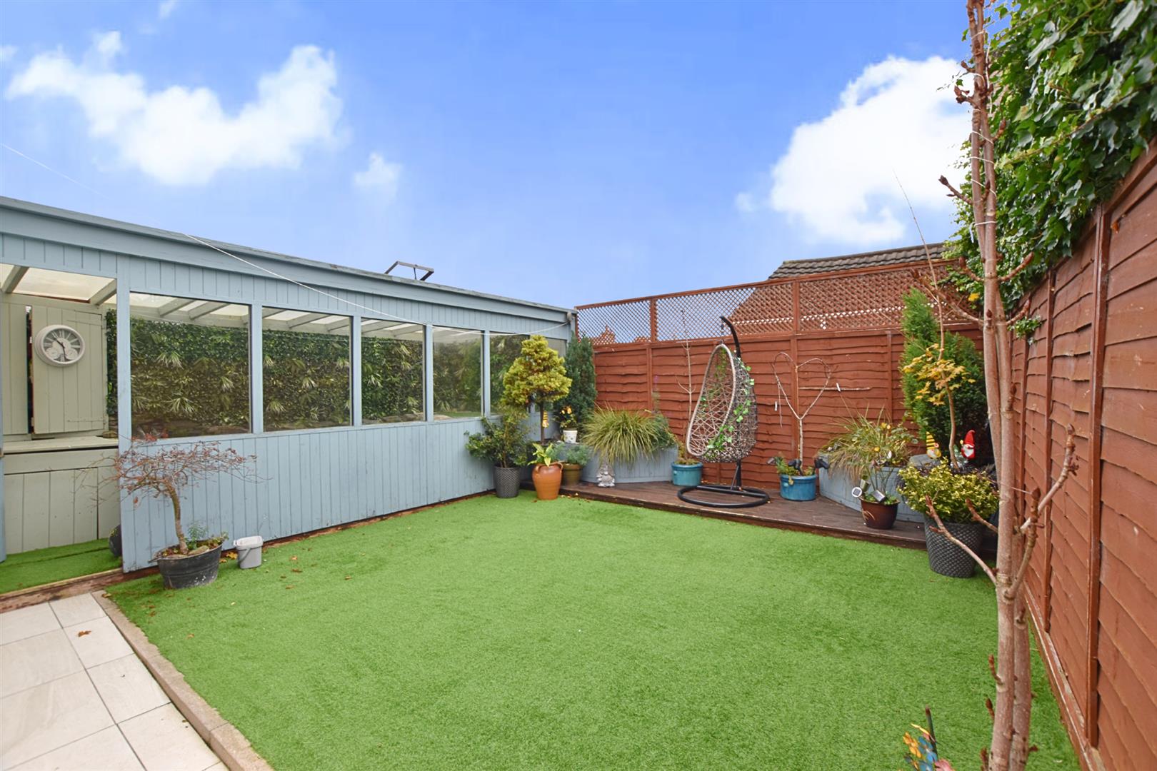 The property stands in both front and rear gardens, the fore garden is concrete for ease of maintenance which also provides additional off road parking. The enclosed rear garden has a paved area which extends to the covered seating area which is ideal for outside entertaining, the remainder of the garden has an artificial lawned area with slightly raised decking to the rear.