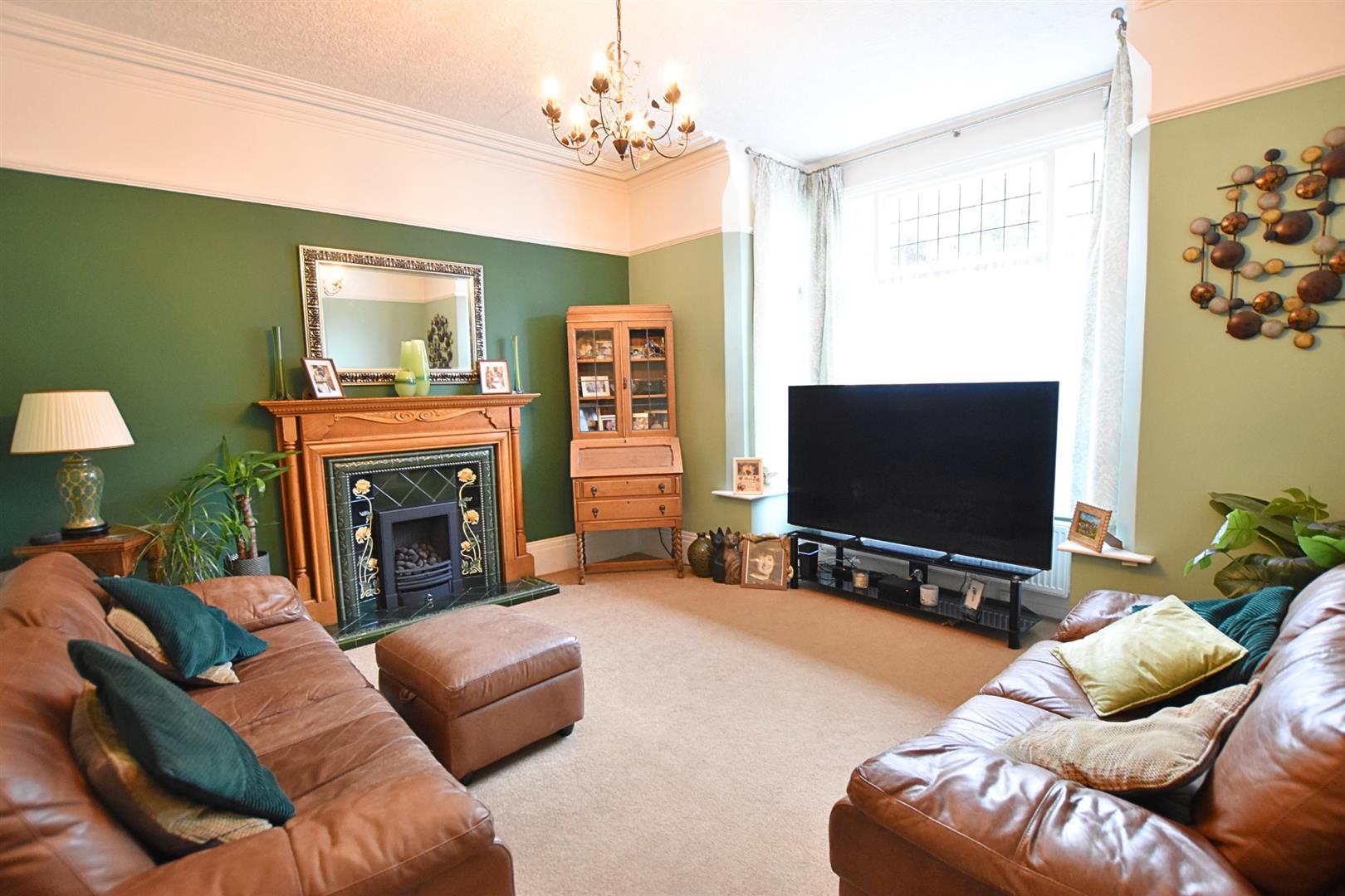 The excellent sized lounge has a double glazed wooden bay window to the front elevation, deep skirting boards, coving and plaster rose to ceiling, a fitted picture rail and radiator. The focal point of the room is the carved wooden fire surround which has a decorative green tiled hearth and being inset with a living flame gas fire.