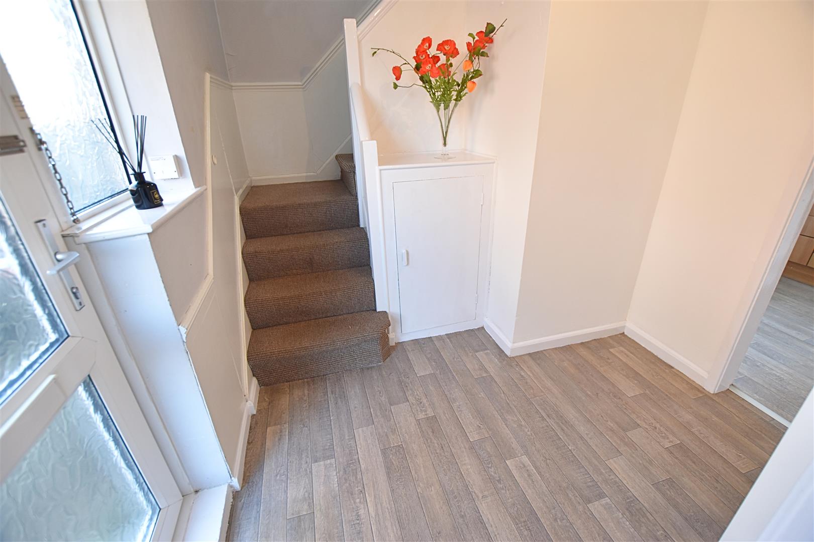 Having wood effect laminate flooring, radiator and carpeted stairs with enclosed banister and handy storage cupboard.