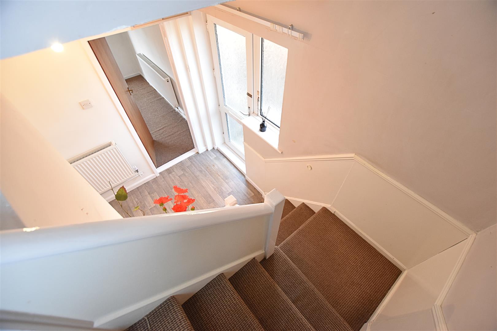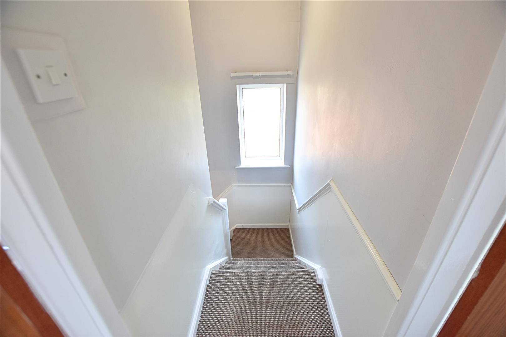 Returned staircase with carpeted flooring, mock panelling to dado height and a uPVC double glazed window.