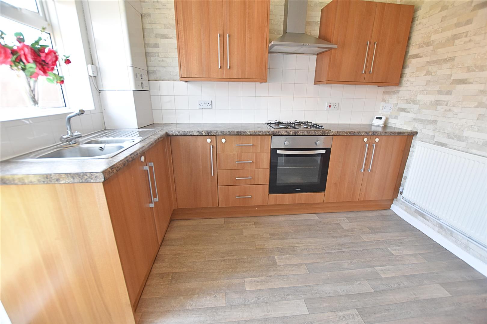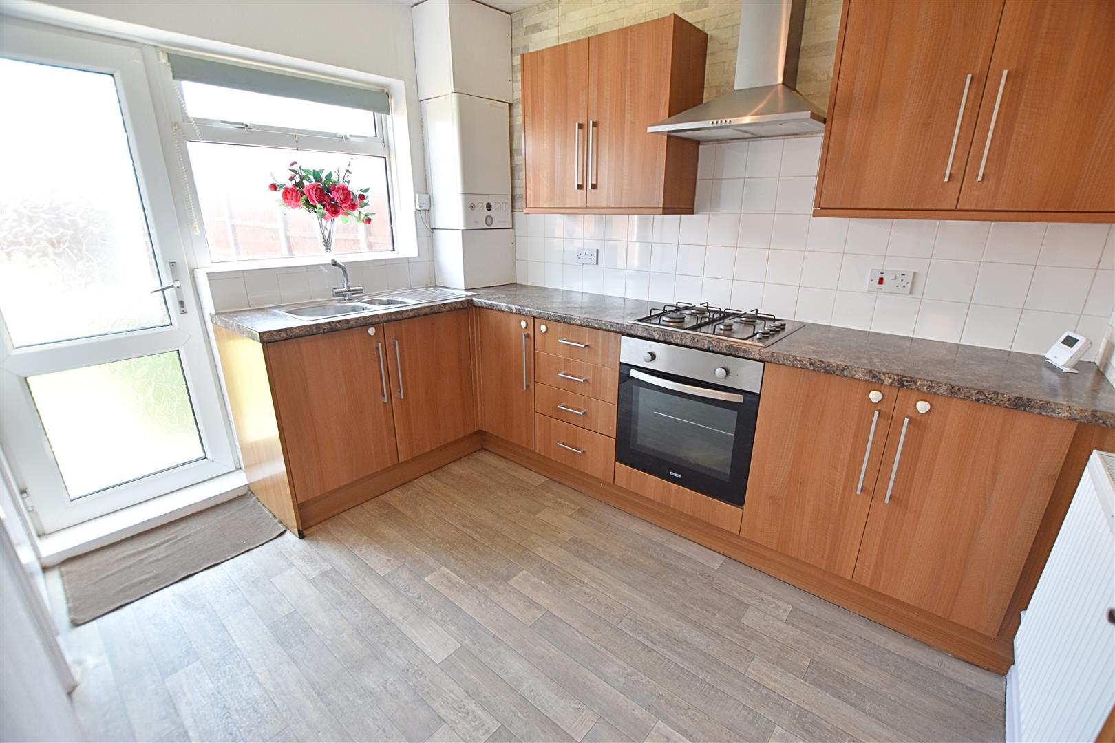 The kitchen benefits from a range of walnut effect wall and base units with contrasting work surfaces and tiled splashbacks incorporating a stainless steel sink and drainer, gas hob with stainless steel chimney style extractor hood above and electric fan assisted oven beneath, space for a fridge freezer and wall mounted boiler. Finished with a pantry cupboard having plumbing for an automatic washing machine, wood effect vinyl flooring, radiator and a uPVC double glazed window and door leading to the garden.