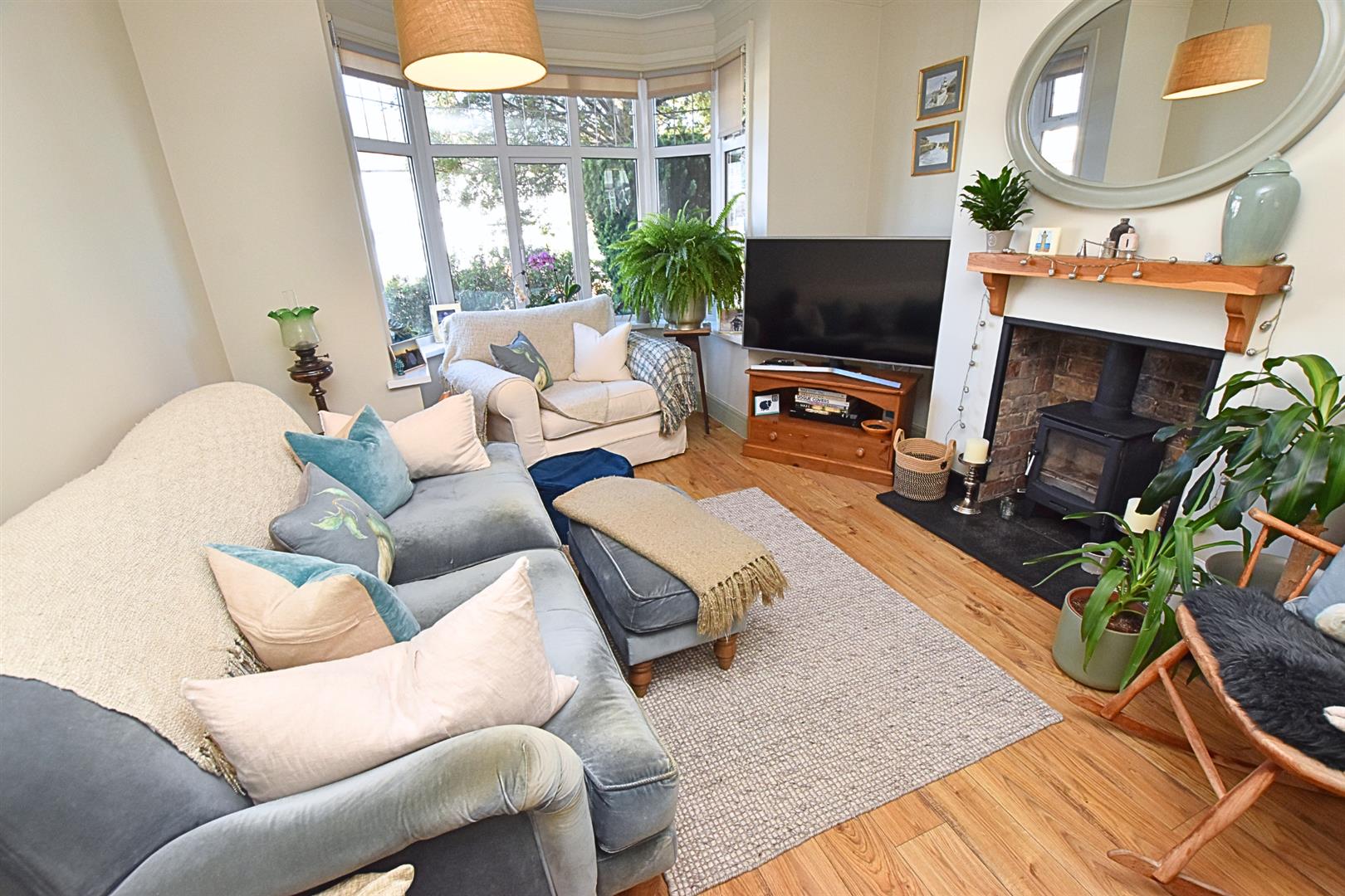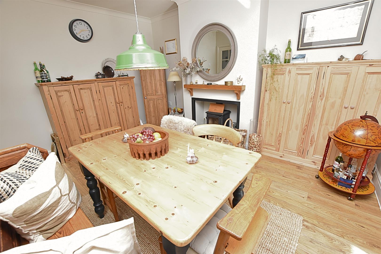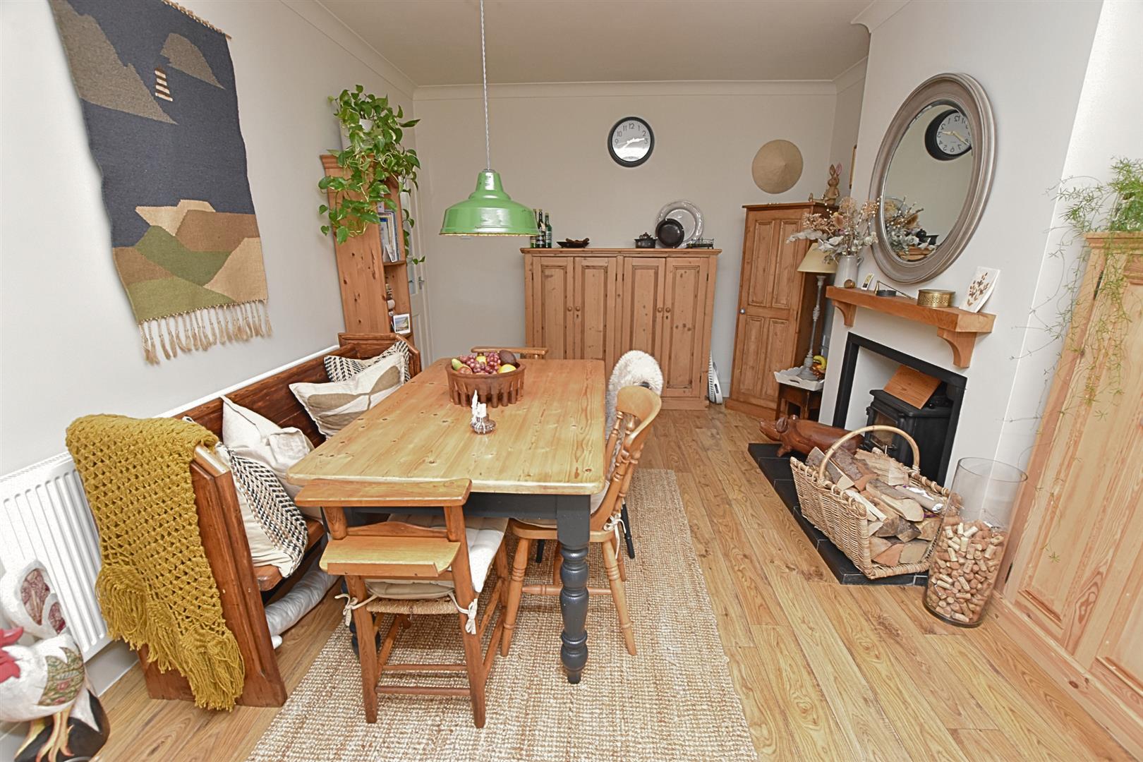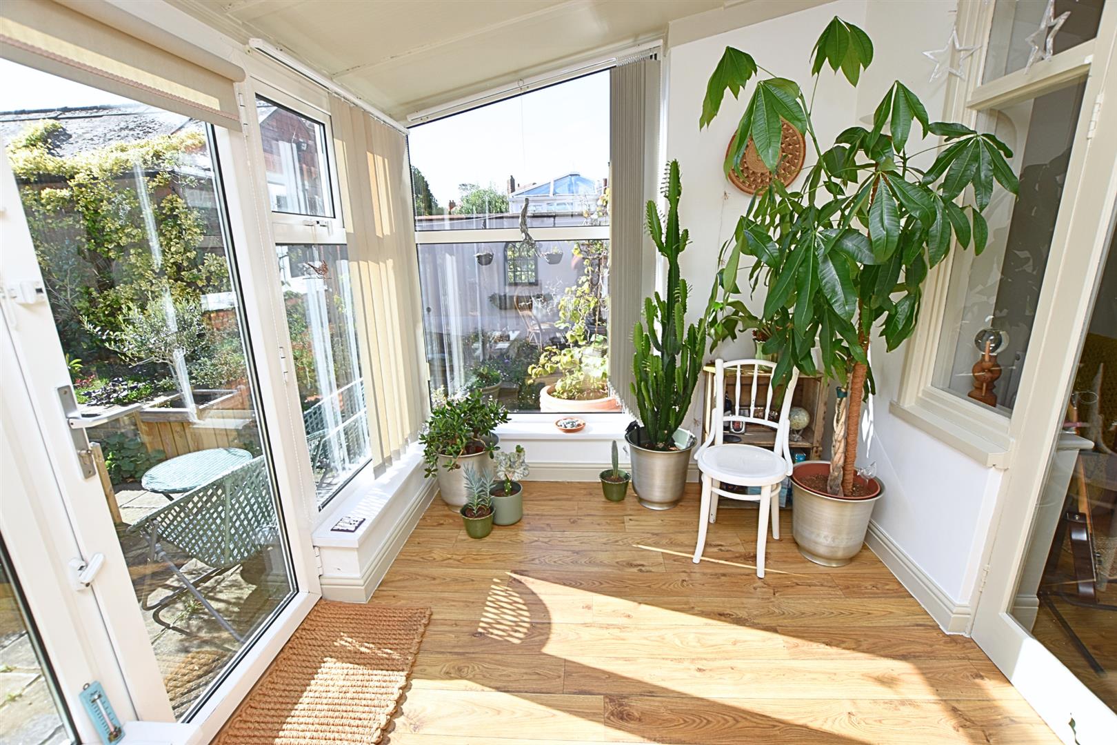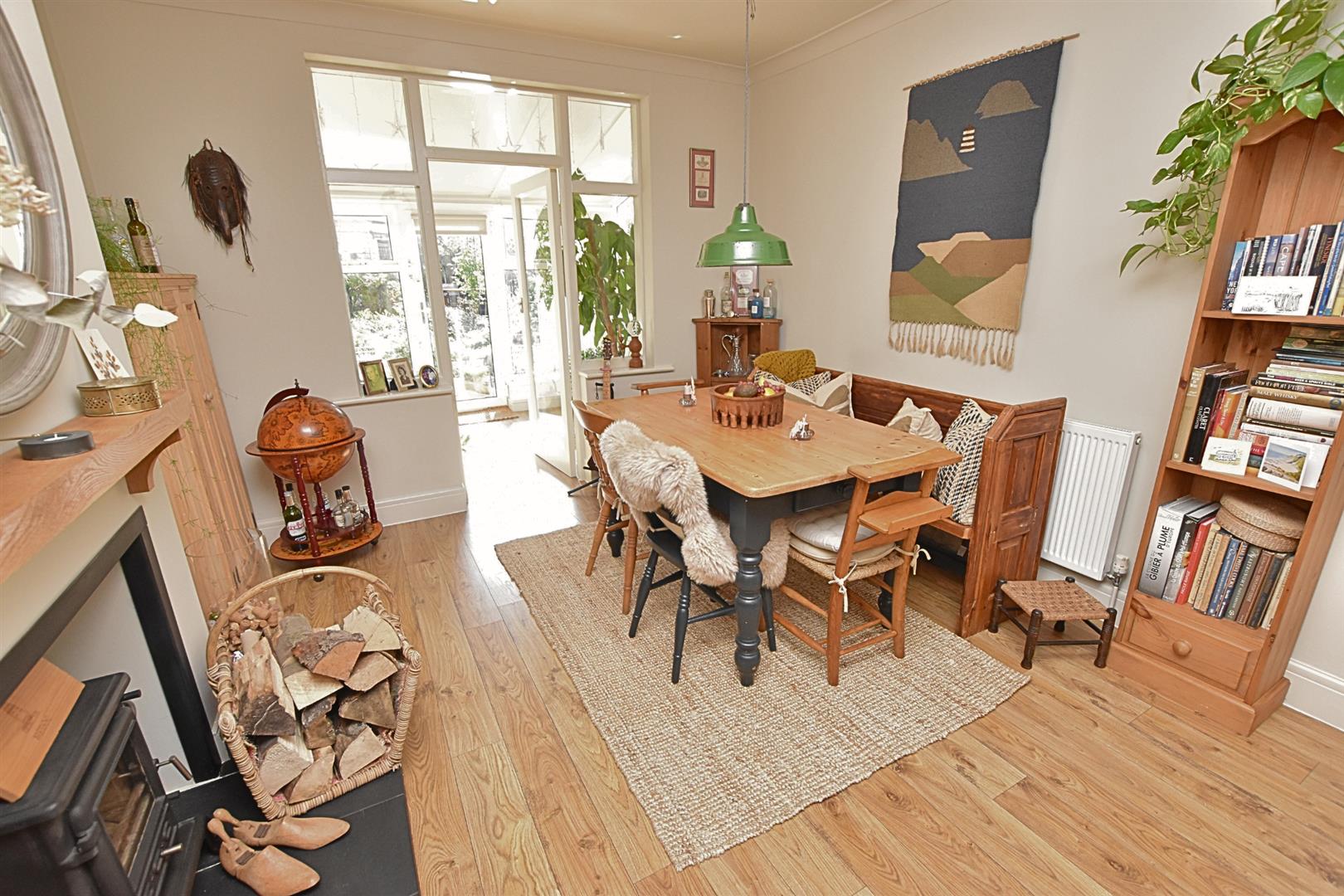 The second reception room is presently used as a dining room and follows the feel of the rest of the home with its coved ceiling, high skirtings, wood effect laminate flooring, radiator and feature open chimney breast with multi fuel stove and tiled hearth. Original glazed door with side and top light windows leading to the sunroom.