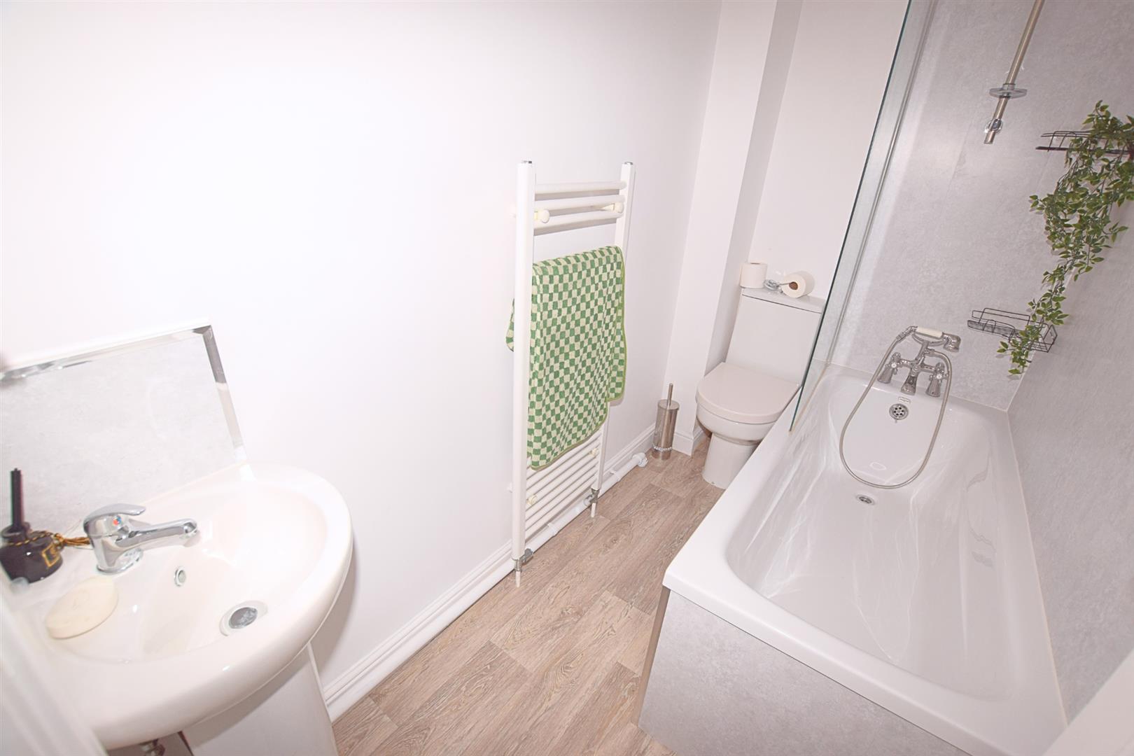 With modern white suite comprising corner set vanity hand basin with chrome mixer tap. Panelled bath with Victorian style shower tap. Low flush WC. Wall mounted towel radiator. Grey vinyl wood effect flooring. Recess lights to ceiling.