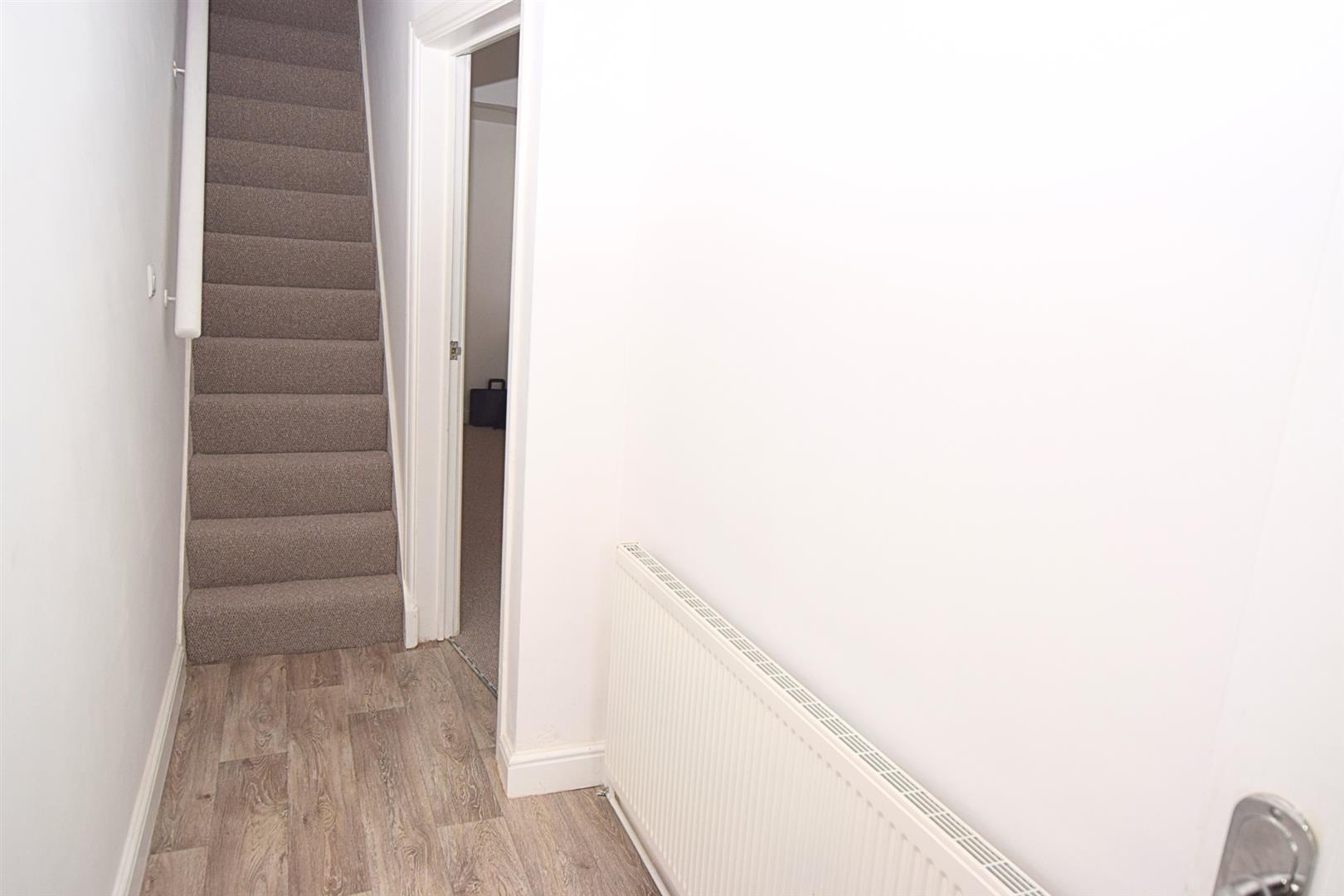 With fashionable grey wood effect vinyl flooring. Central heating radiator. Stair case with fitted carpet and wall mounted hand rail.