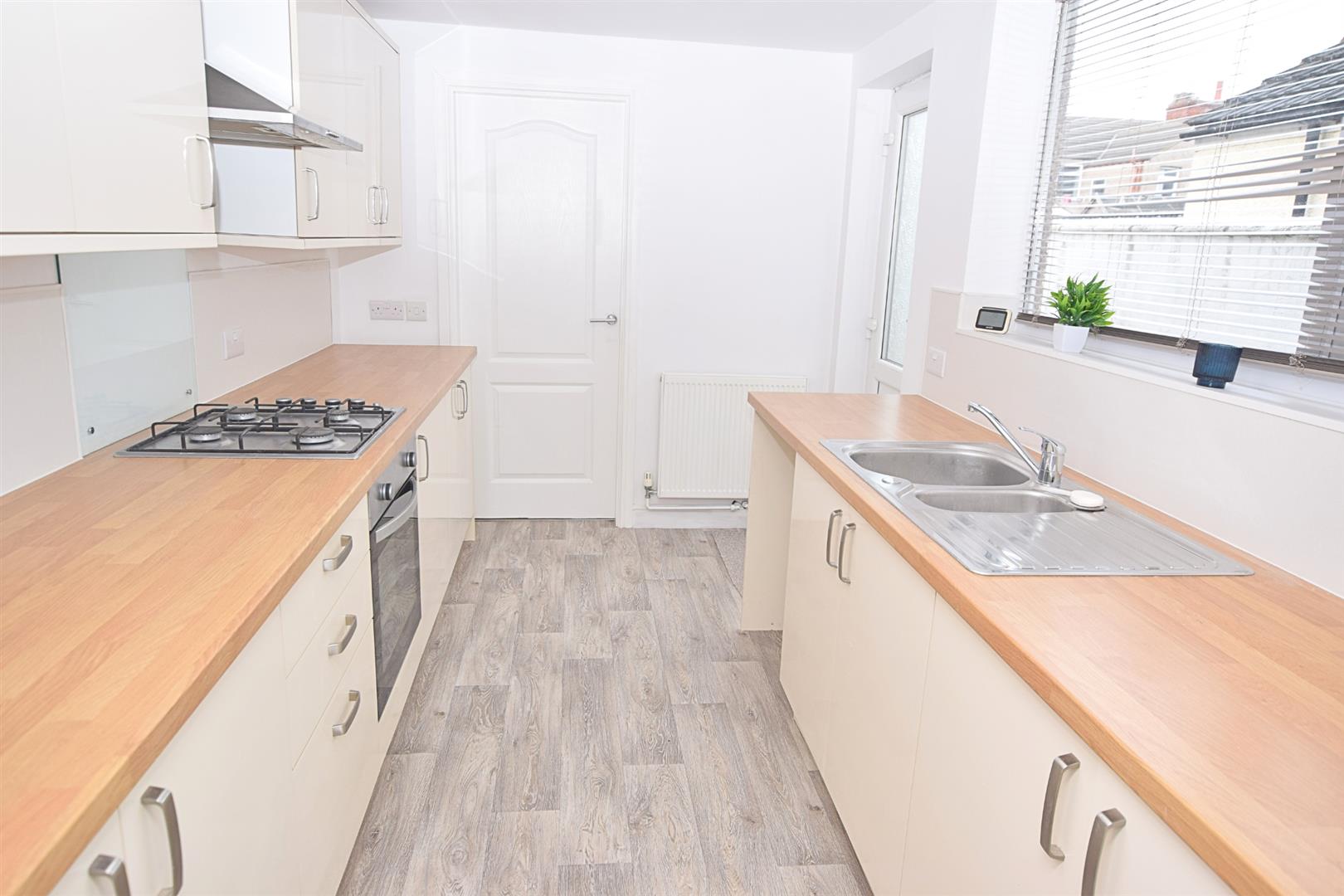 Fitted with a modern range of wall and base units in a contemporary high gloss finish with chrome handles. Complimentary wood effect work surfacing with inset 1.5 bowl stainless steel sink unit. Built in oven, hob & extractor. Space for undercounter fridge. Central heating radiator. Grey wood effect vinyl flooring. Double glazed window and door to rear