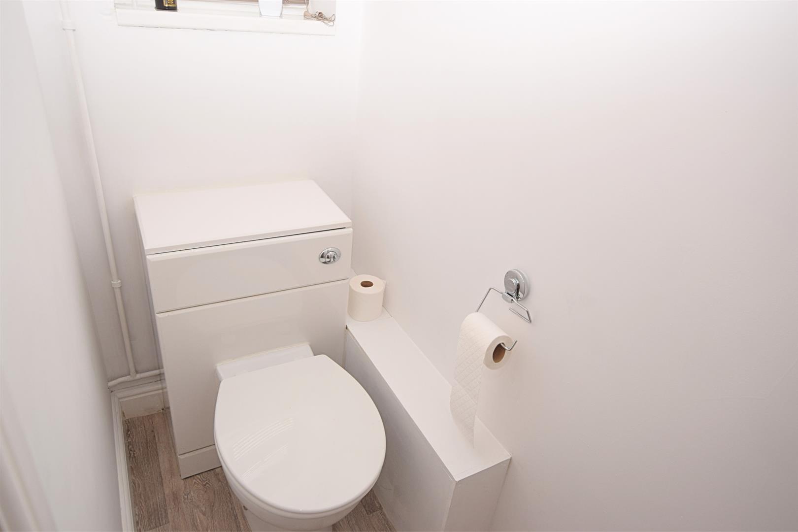 With modern white encased low flush WC. Central heating radiator. Double glazed window to rear