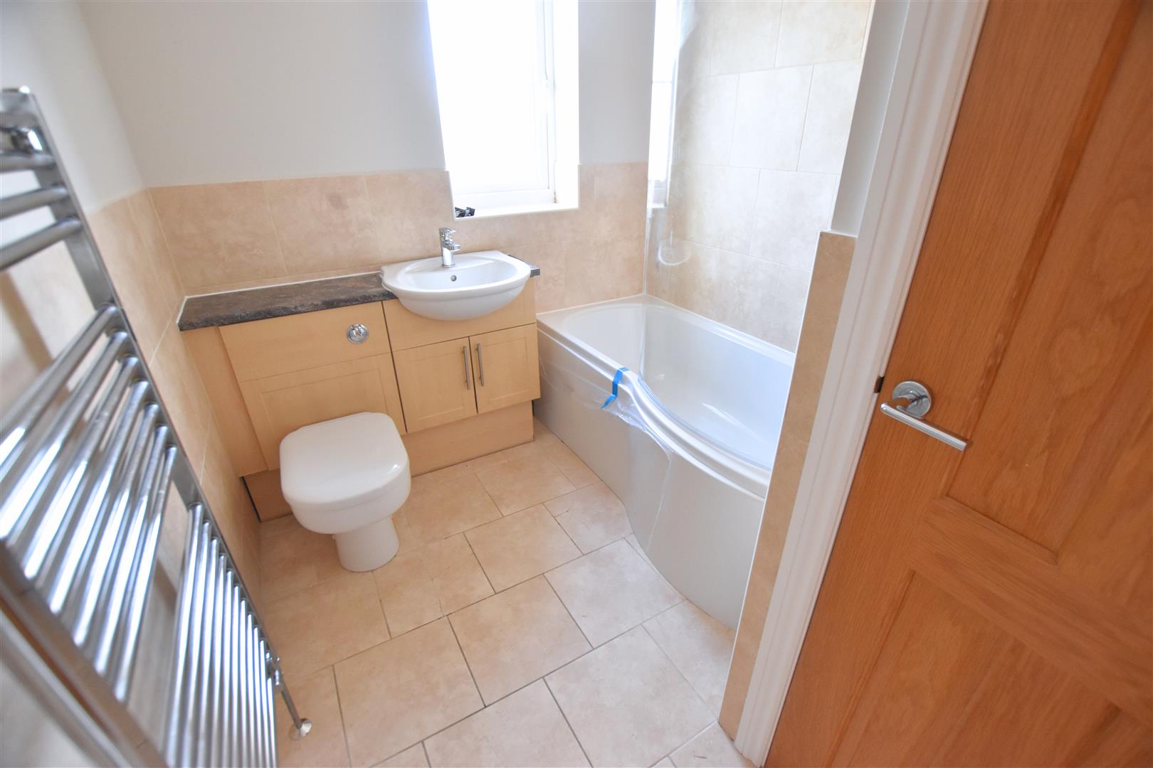 The bathroom benefits from a white three piece suite comprising of; P-Shaped bath with shower over and curved screen, wood effect combination unit housing the hand wash basin and low flush wc with hidden cistern. Finished with part tiling to the walls, full tiling to the floors, down lights to the ceiling, heated towel rail, uPVC double glazed window to the front aspect and linen cupboard.