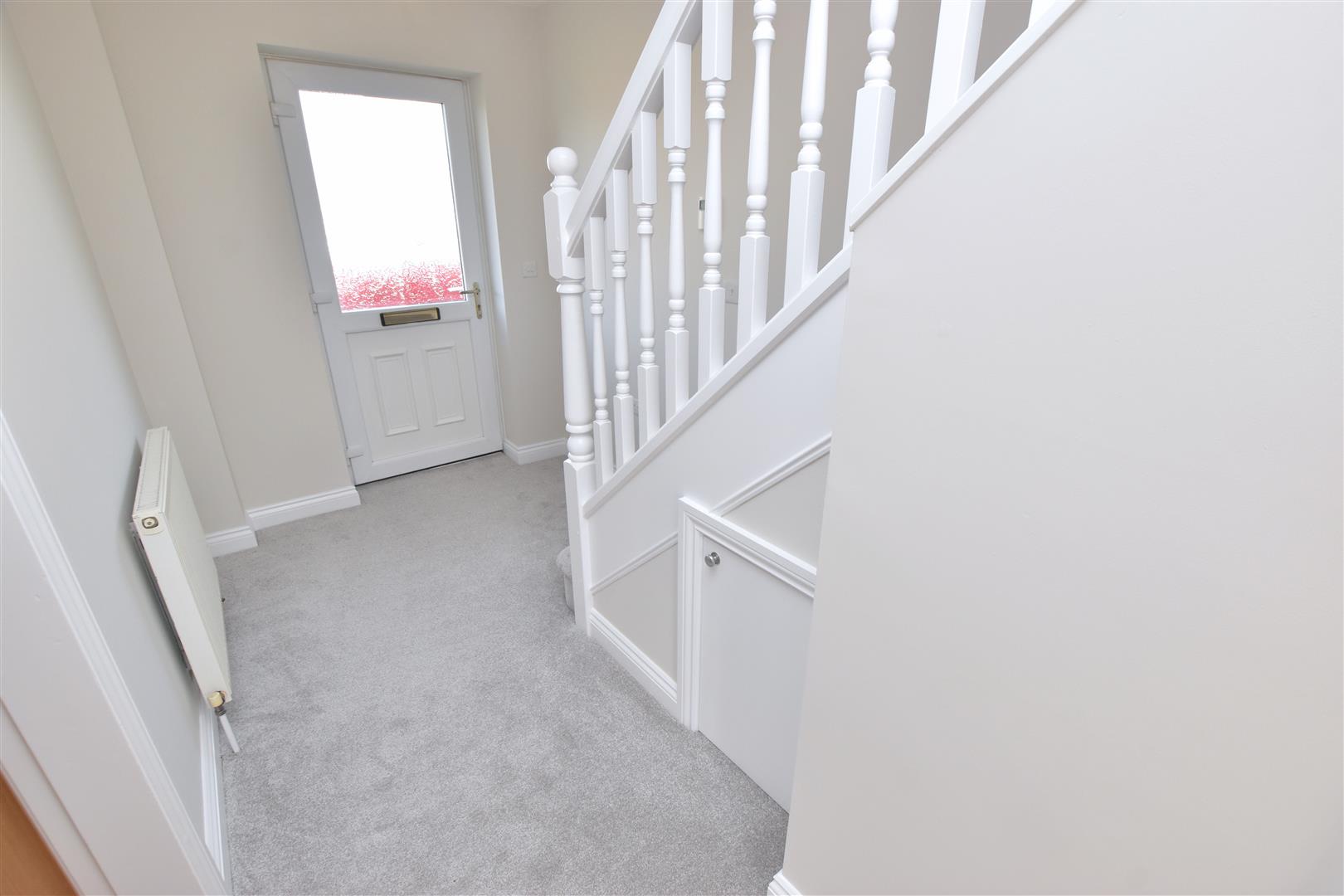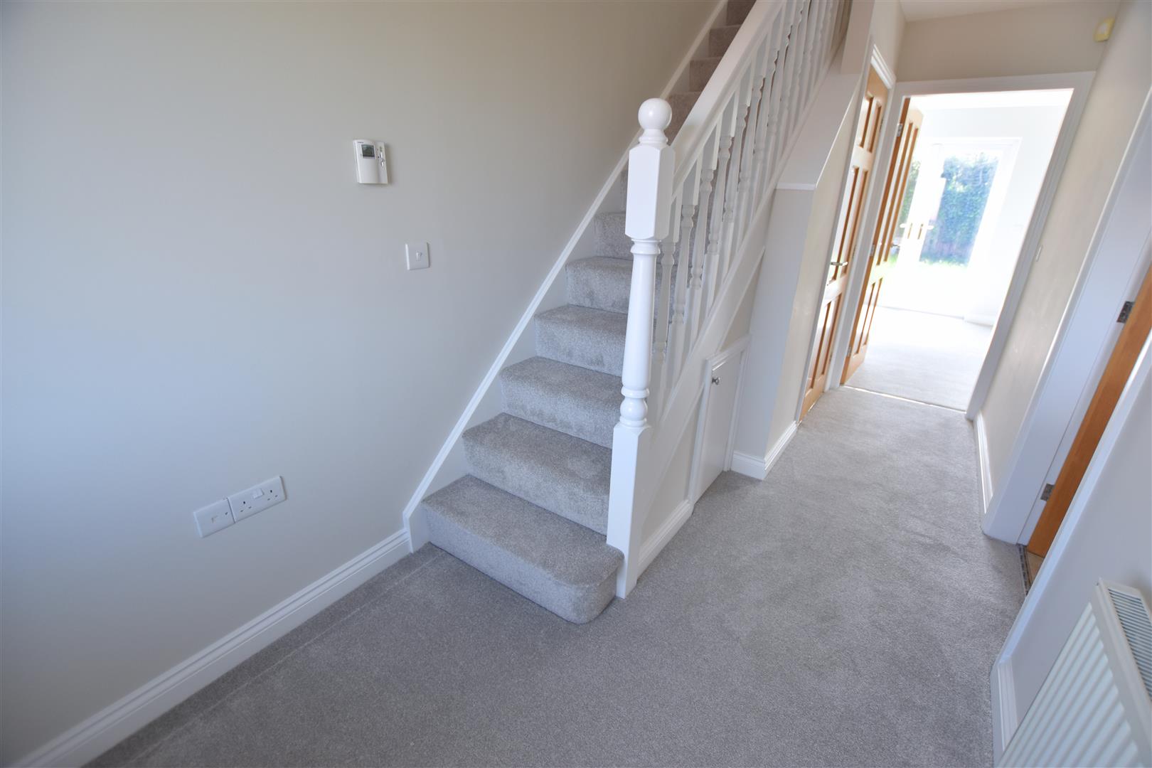 Having newly fitted carpeted flooring with carpeted stairs, white open spindle balustrade and handy storage beneath, radiator and solid oak connecting doors.
