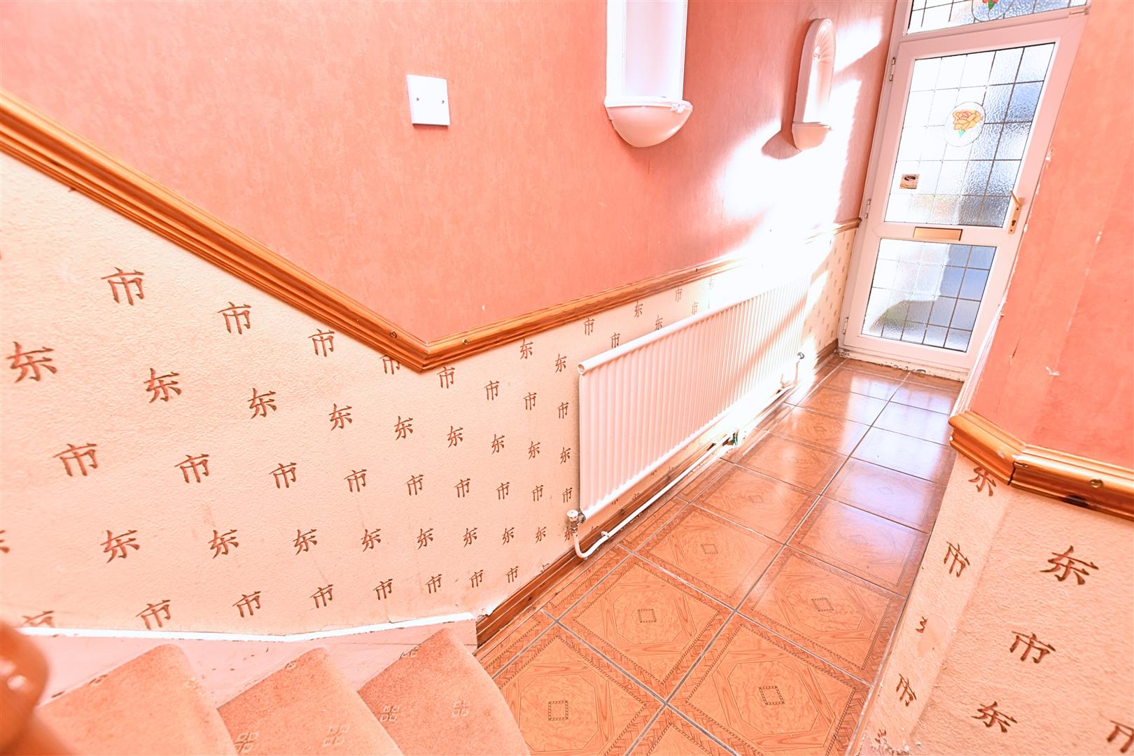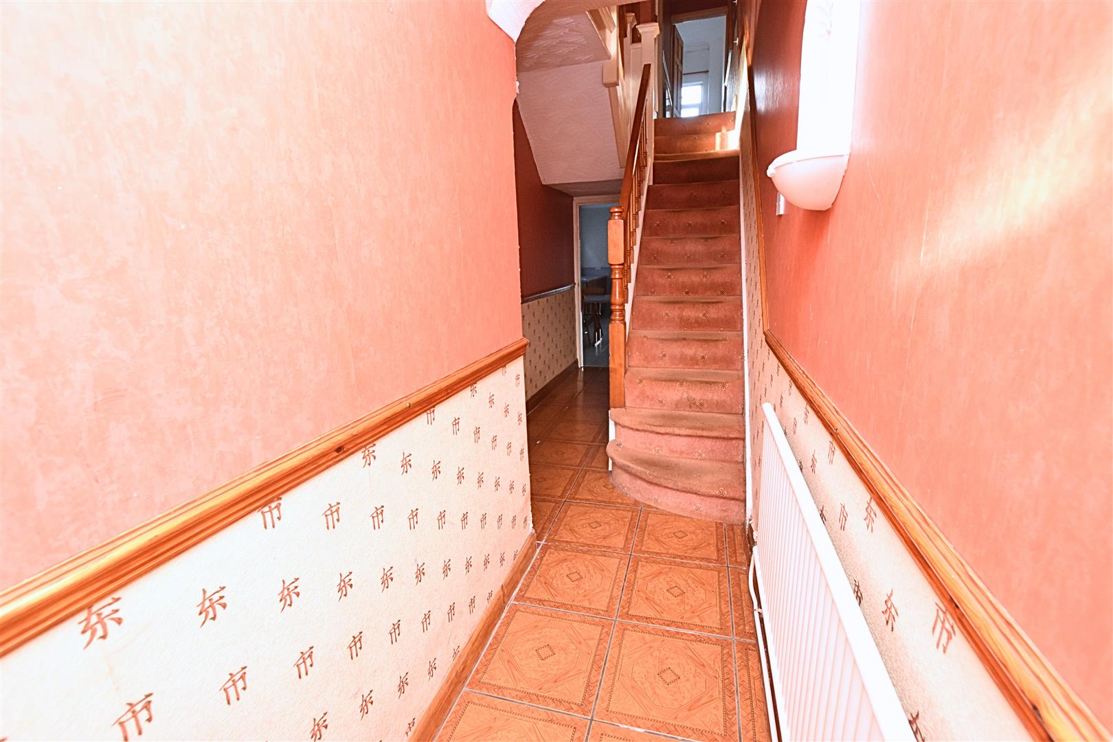 The entrance hallway has coving to the ceiling, dado rail, radiator and carpeted stairs leading to the first floor with open wooden spindle balustrade and handy under stairs storage cupboard.