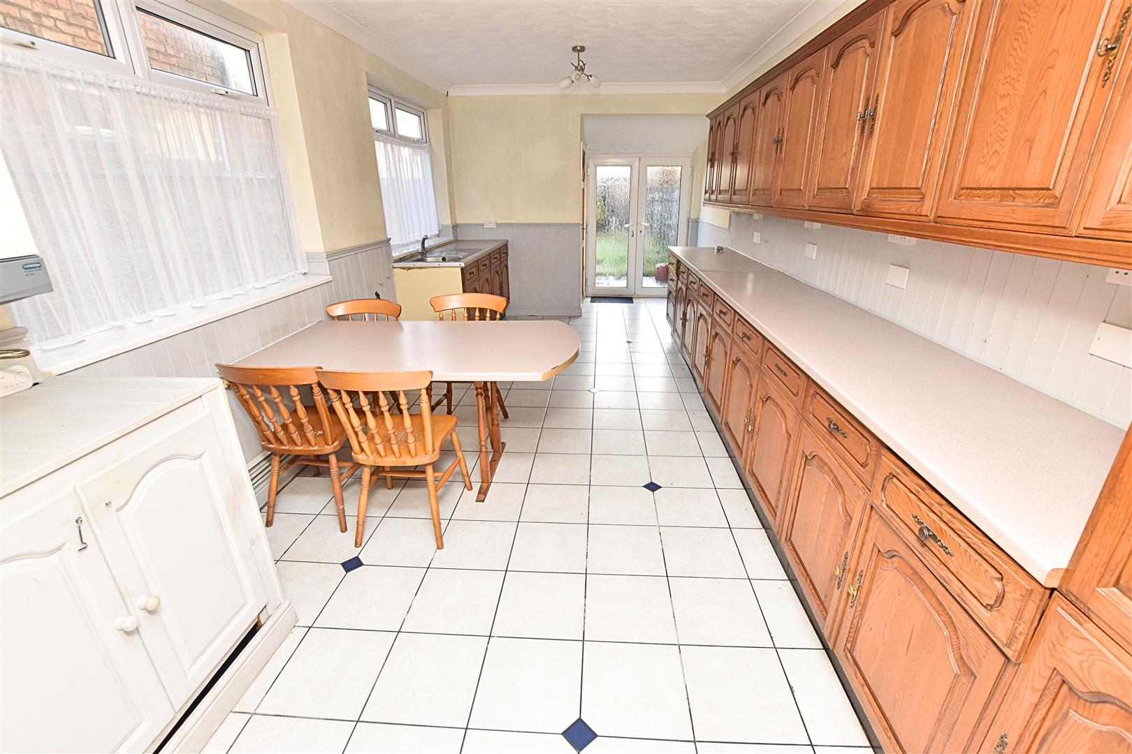 The larger than average dining kitchen benefits from a range of wood effect fronted wall and base units with contrasting work surfaces and tiled splash backs incorporating a stainless steel sink and drainer with ample space for a cooker and freestanding fridge freezer. Finished with coving to the ceiling, tiled flooring, radiator, wall mounted boiler, two uPVC double glazed windows to the side aspect and uPVC double glazed French doors leading to the rear garden. Handy utility cupboard with plumbing for an automatic washing machine.
