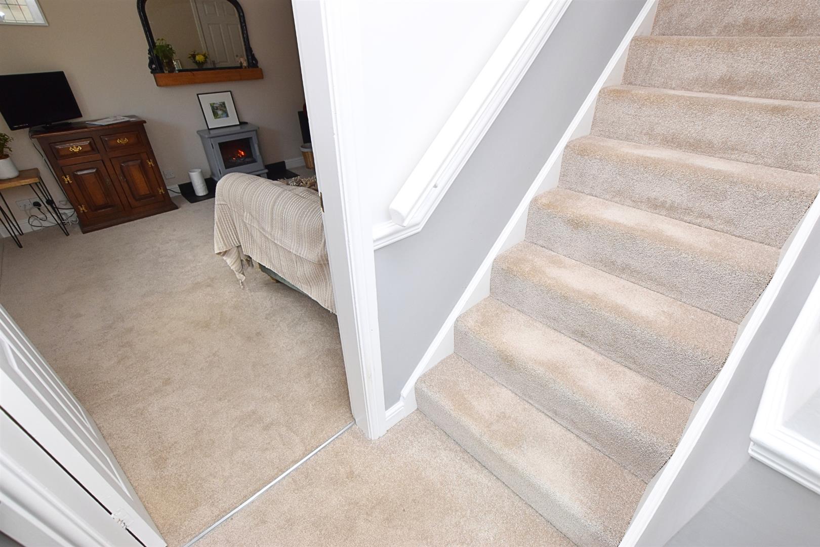 Having carpeted flooring with carpeted stairs leading to the first floor, hand rail and dado rail.