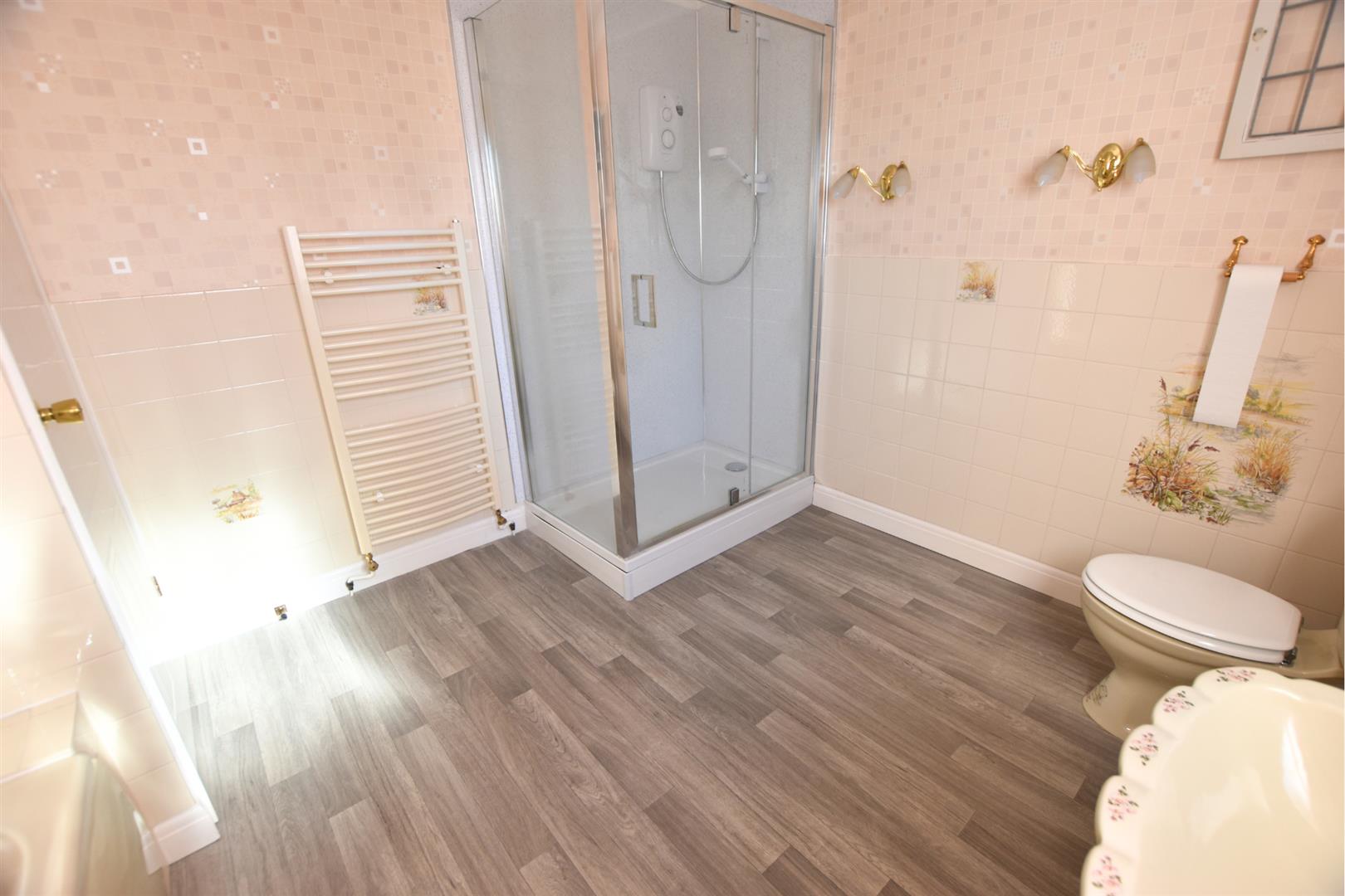 The larger than average bathroom benefits from a four piece suite comprising of; Bath, pedestal hand wash basin, low flush wc and walk in shower with glazed screens. Finished with part tiled walls, wood effect vinyl flooring, coving, heated towel rail and uPVC double glazed window to the rear aspect.