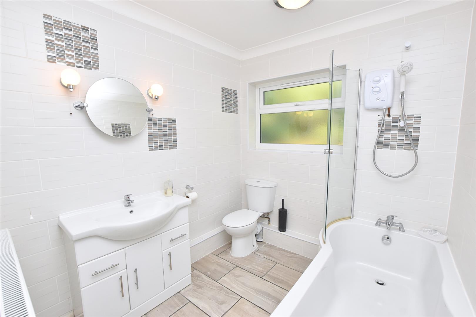 This modern fitted family bathroom is fitted with a suite in white comprising a P shaped panelled bath having an electric shower and screen above, a white high gloss vanity unit with a mirror and wall lights above and a low flush wc. Double glazed window. Tiled floor. Complementary tiling to walls.