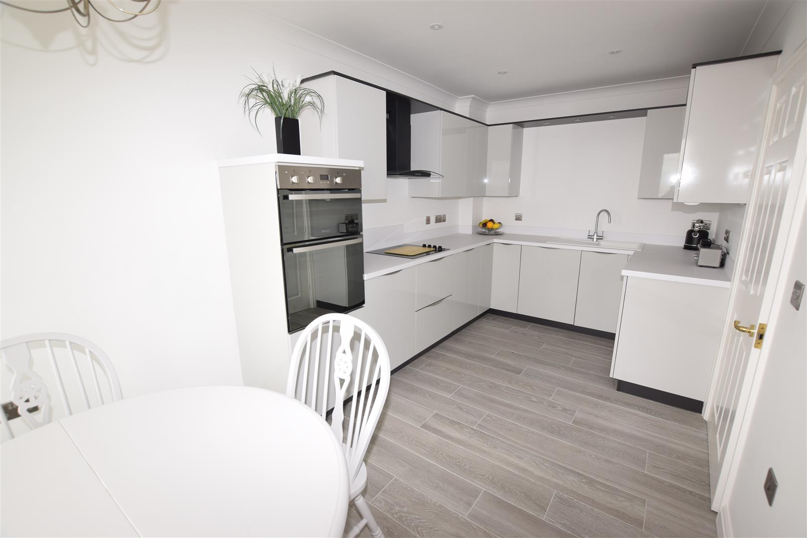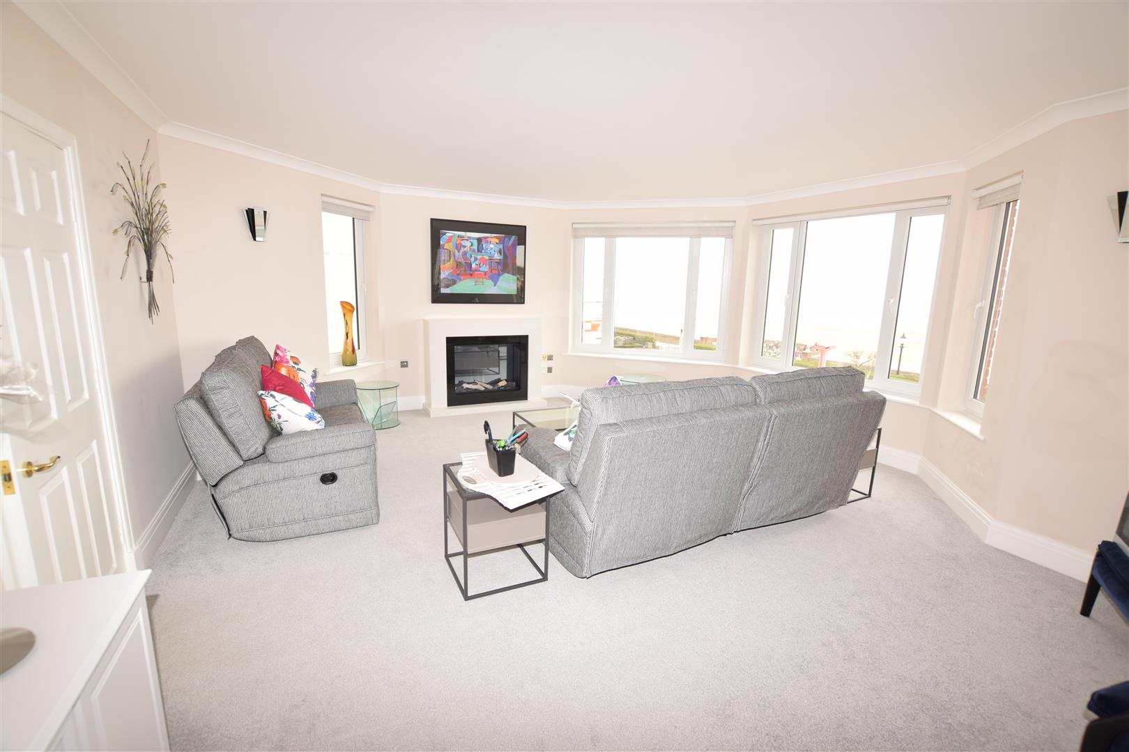 Providing a range of fitted units in a fashionable grey, high gloss finish with quartz work surfacing and inset sink unit. Contrasting black pelmet top with recess lighting. Built in appliances include the washing machine, refrigerator, freezer, double oven, ceramic hob & extractor hood. Space for table and chairs ideally positioned for views via the large double glazed picture windows to the promenade and Estuary. Grey wood effect ceramic tiled floor