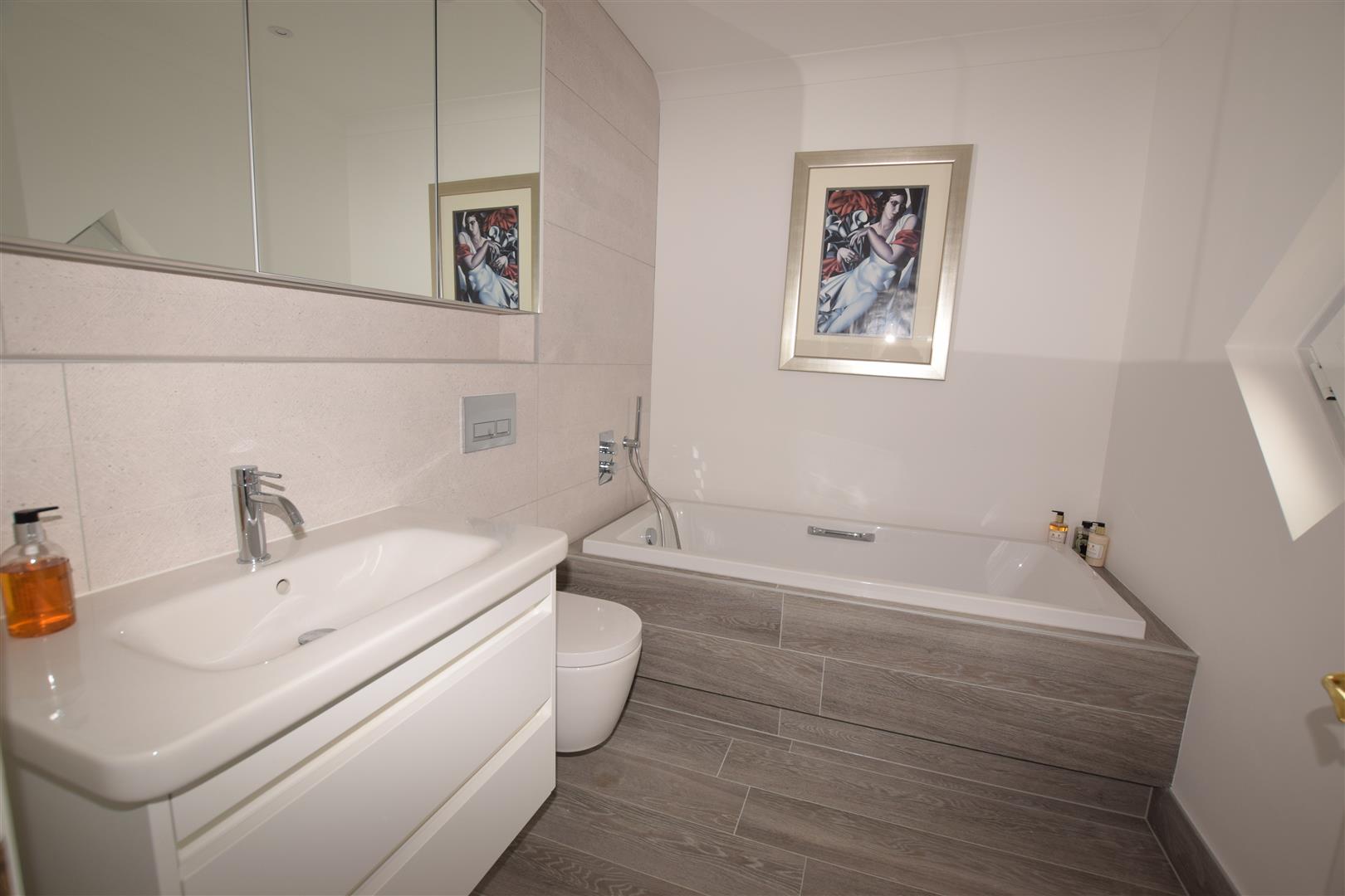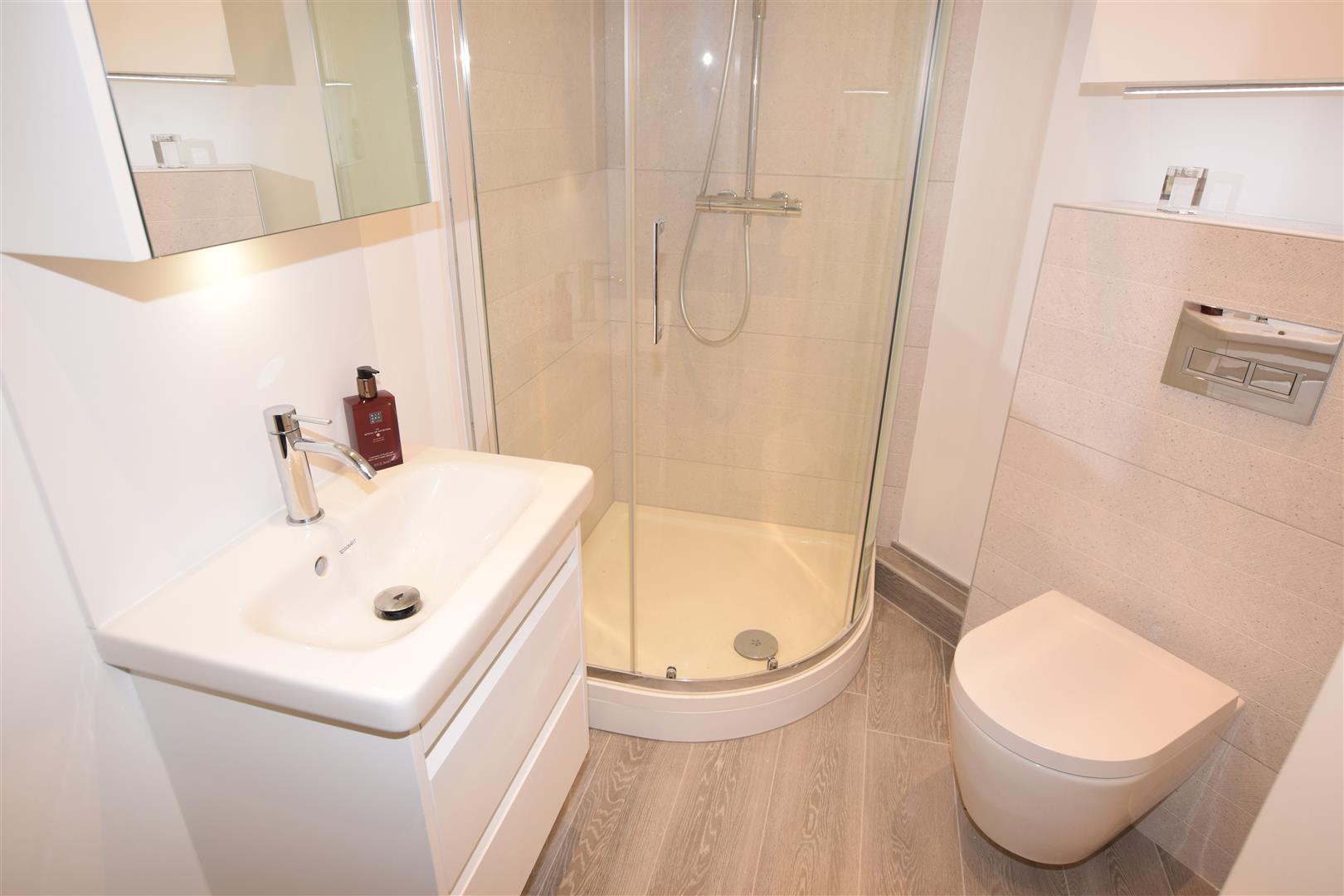 Again refurbished by Richard Sutton to offer a corner set shower enclosure with twin head rainforest shower system, concealed low flush WC, vanity hand basin over a wall mounted cupboard. Chrome radiator, extractor unit, Wood effect ceramic tiled floor.