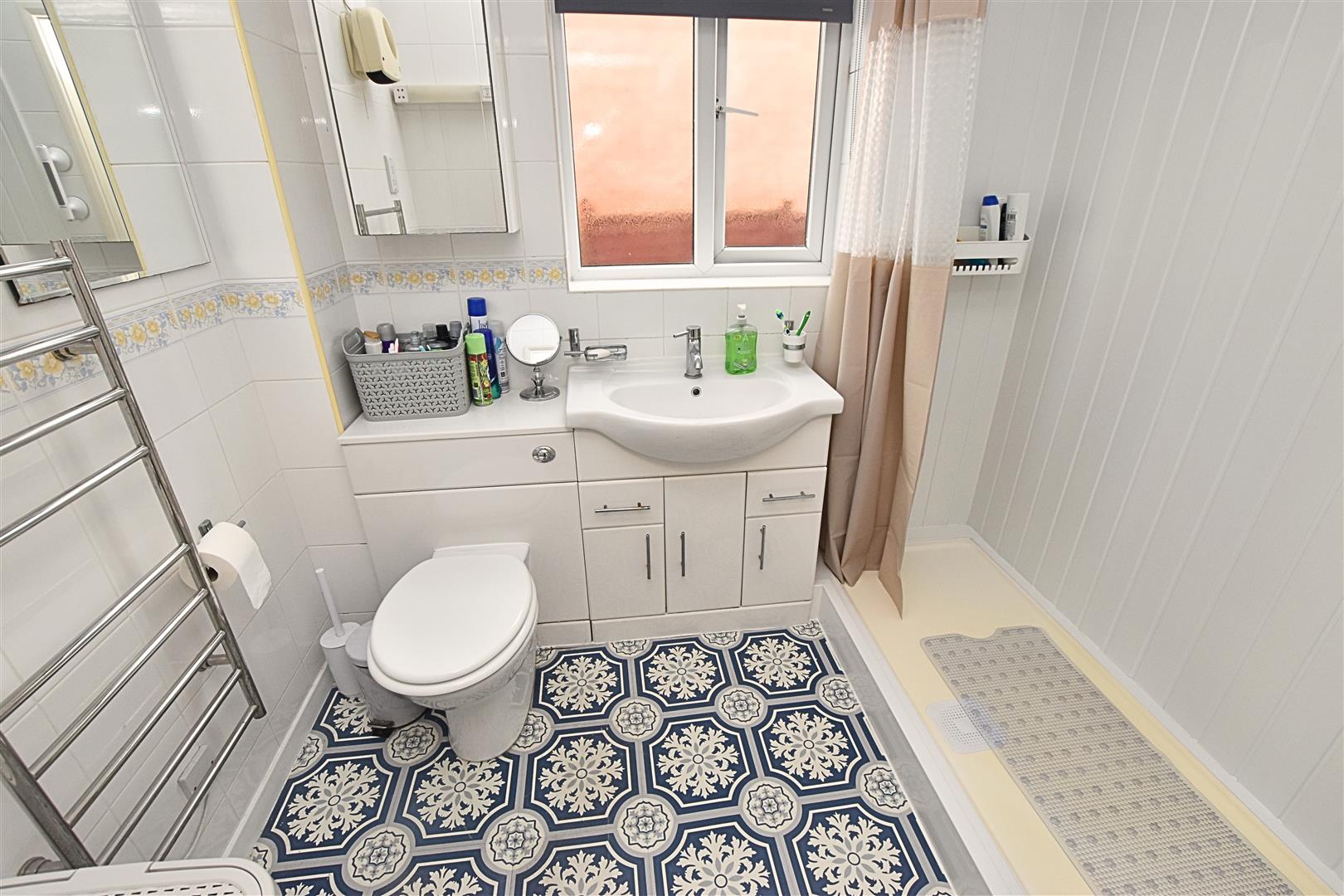 This contemporary styled shower room is fitted walk in shower area which includes an electric shower, uPVC tongue and groove wall boarding and a glass front screen together with a vanity unit comprising a semi recessed sink with cupboards below and a concealed wc. Double glazed window. Heated towel rail. Patterned style tiled flooring.