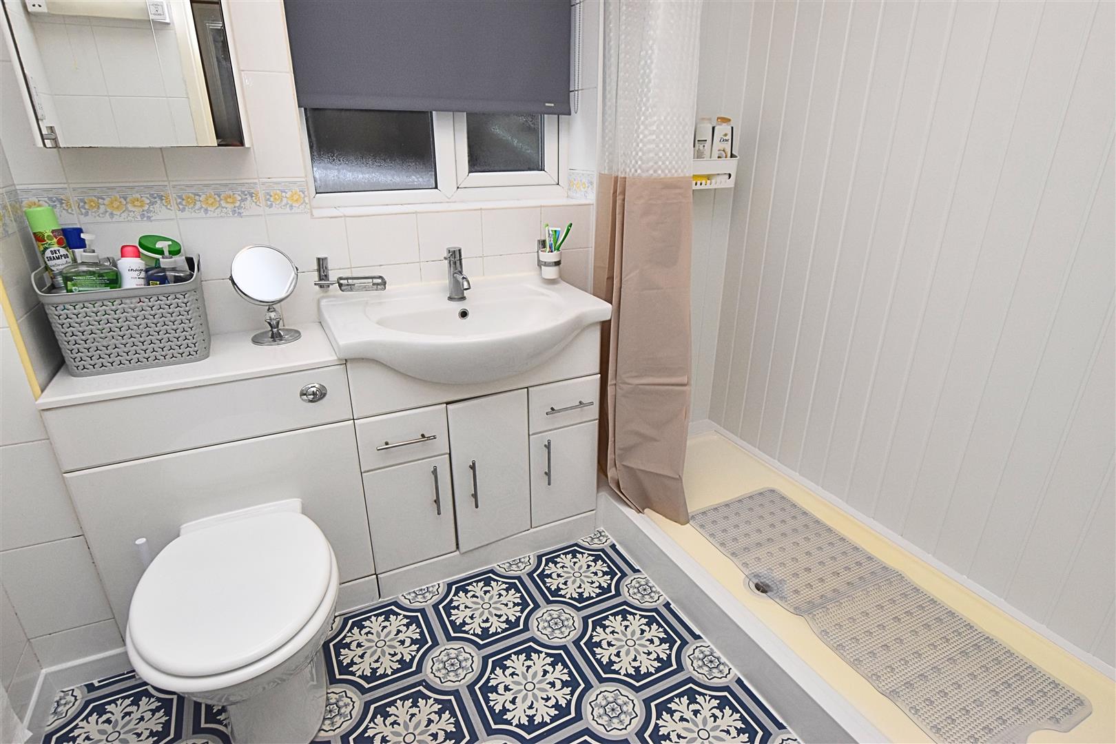 This contemporary styled shower room is fitted walk in shower area which includes an electric shower, uPVC tongue and groove wall boarding and a glass front screen together with a vanity unit comprising a semi recessed sink with cupboards below and a concealed wc. Double glazed window. Heated towel rail. Patterned laminate flooring.