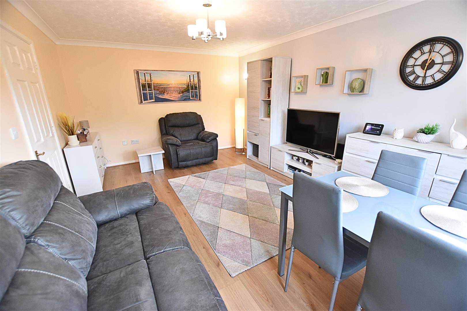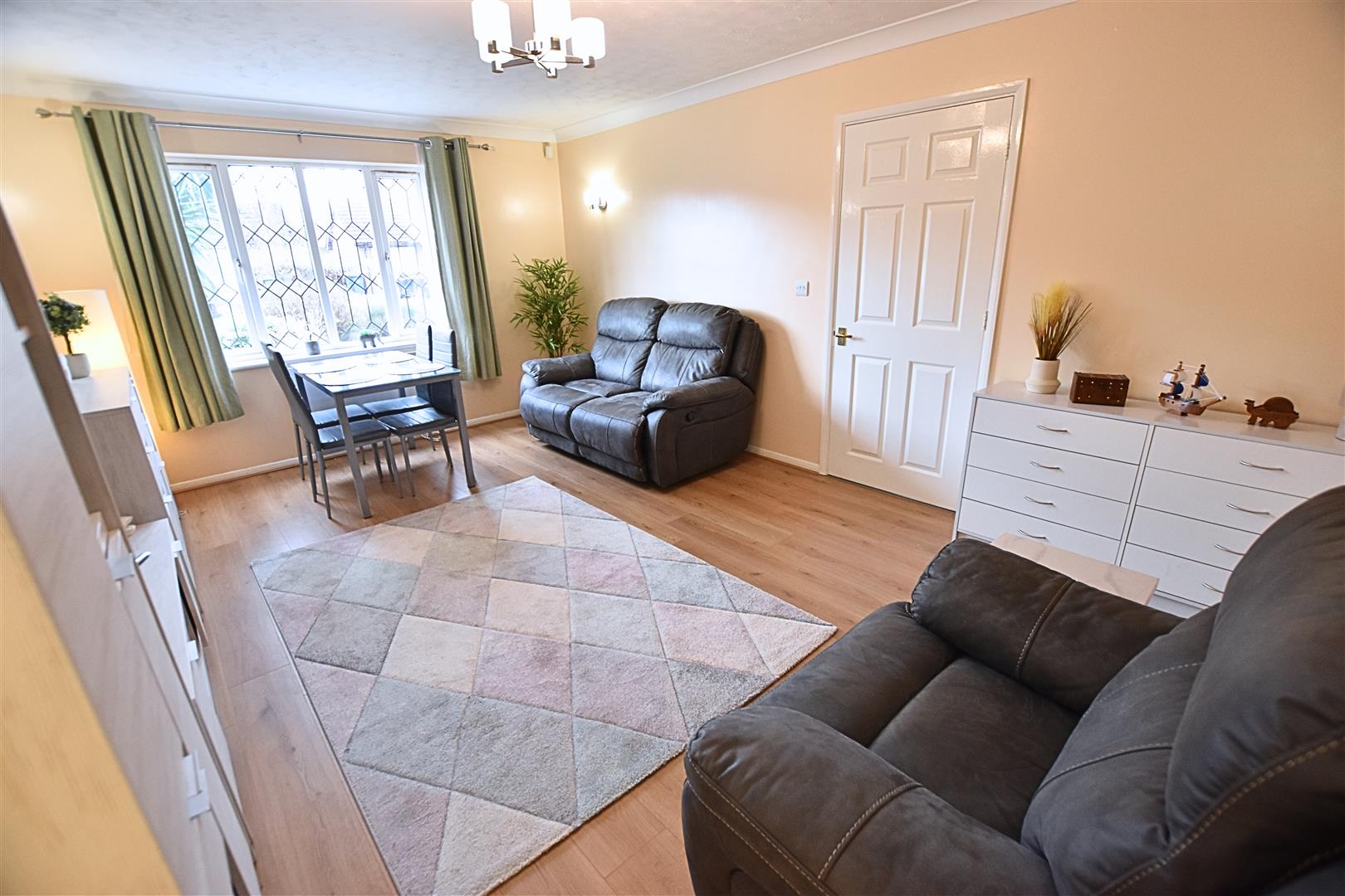 This excellent sized room has a double glazed window to the front elevation, coving to ceiling, striking laminate flooring and a Newly fitted economy heater . Ample space for both a dining table and sofas.