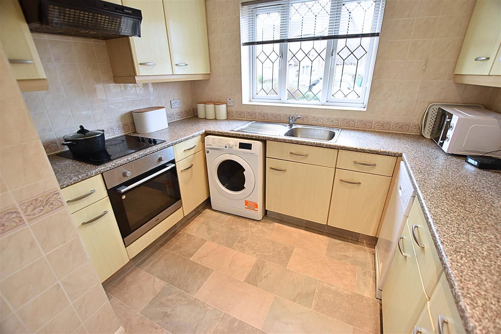 Fitted with a good range of modern base and wall cupboards incorporating a built in electric oven, hob with an extractor fan above. The contrasting mottled work surfaces are inset with a stainless sink unit and has space for a dishwasher and washing machine below. Extensively tiled walls. Coving to ceiling inset with spot lights. Double glazed window to the front elevation.
