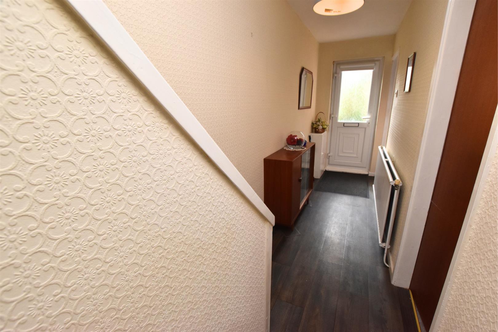 The hallway has wood effect laminate flooring with a narrow carpeted staircase leading to the first floor. Handy under stairs storage cupboards and radiator.