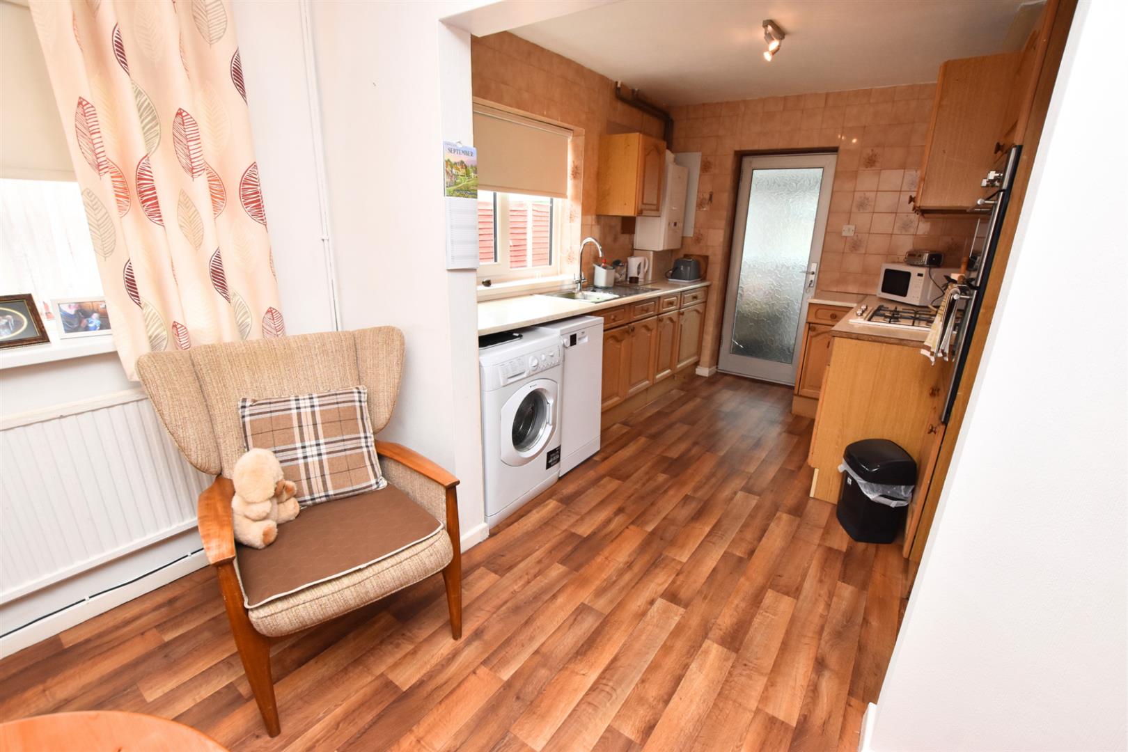 The open plan kitchen diner benefits from wood front wall and base units with contrasting work surfaces and tiled splashback incorporating a stainless steel sink and drainer, gas hob, one an a half electric fan assisted ovens, washing machine and dishwasher. Wall mounted boiler. Finished with wood effect vinyl flooring, two uPVC double glazed windows to the side aspect and a radiator. Ample room for a dining table. Door leading to the sunroom.