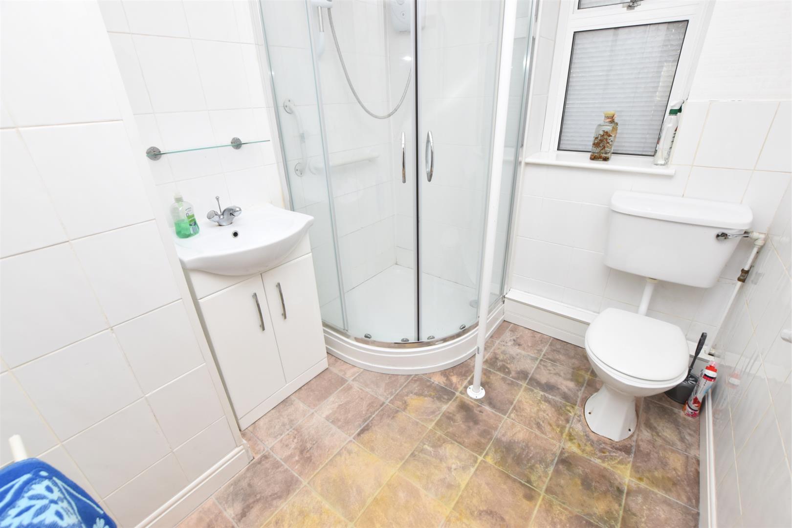 The shower room benefits from a white three comprising of corner shower with curved glazed screens and electric shower fitted, vanity hand wash unit with handy storage cupboard and low flush wc. finished with part tiled walls, tiled effect vinyl flooring and uPVC double glazed window to the rear.