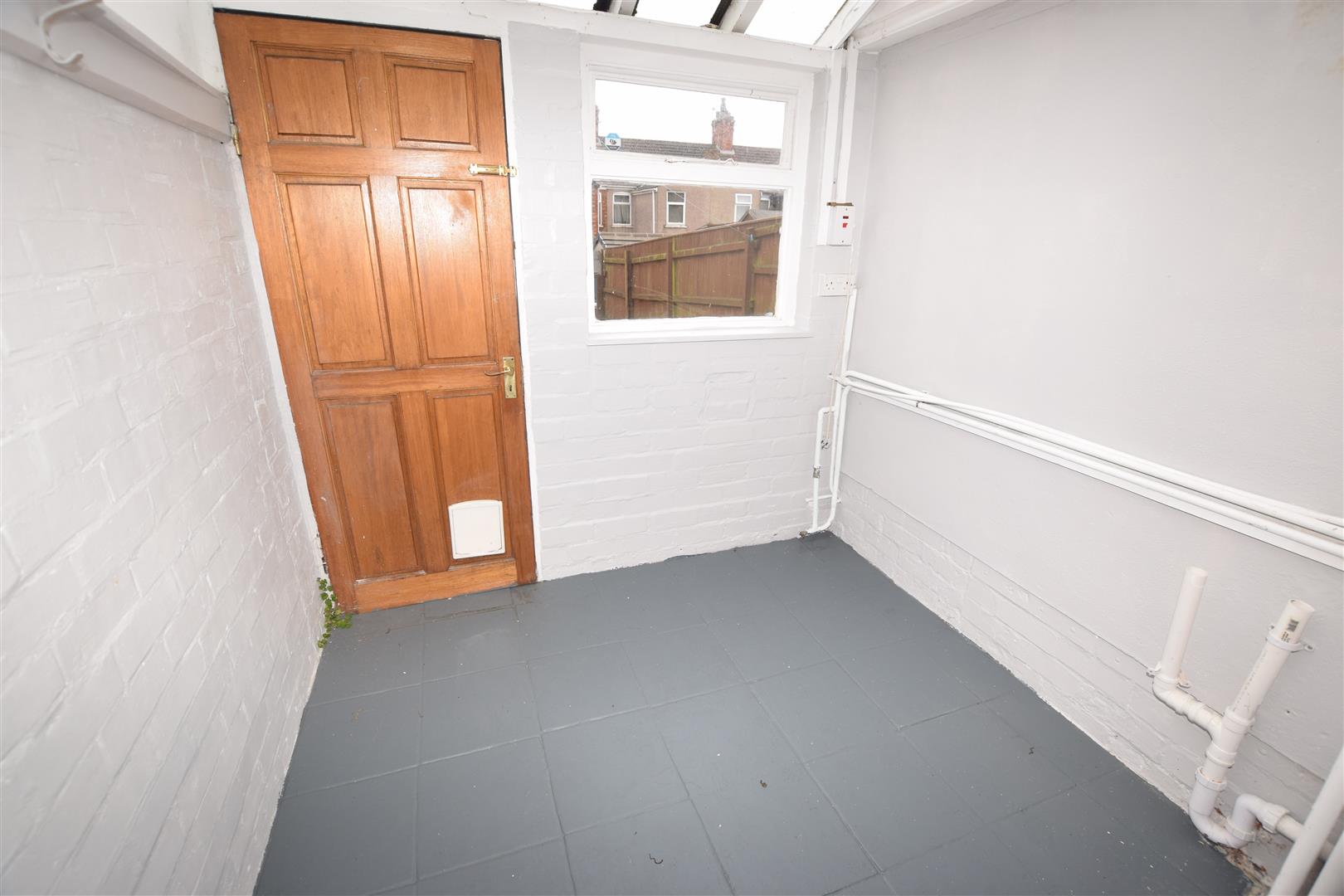 Providing plumbing for automatic washing machine. Timber door and single glazed window to rear. Tiled flooring.