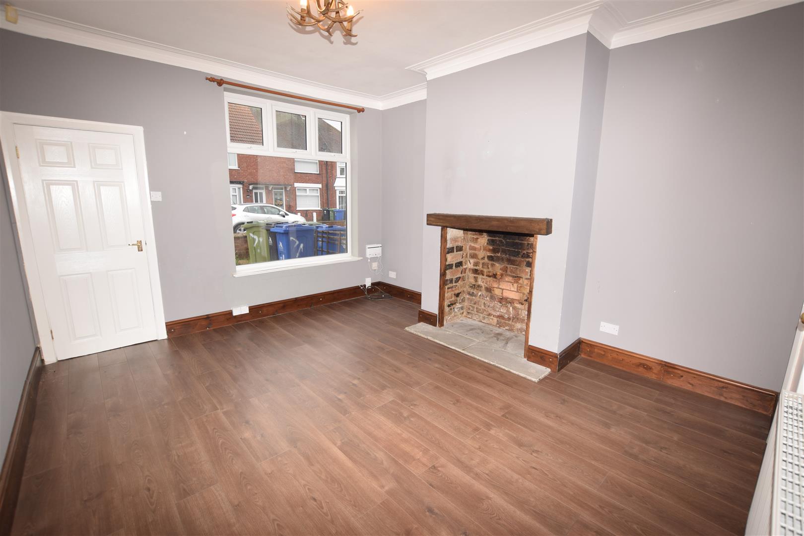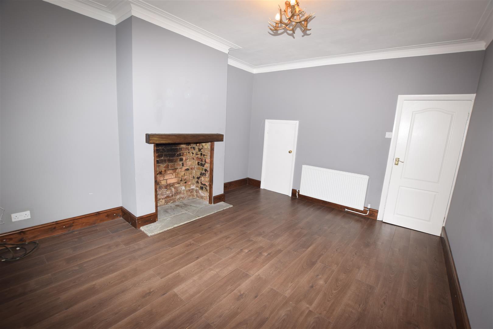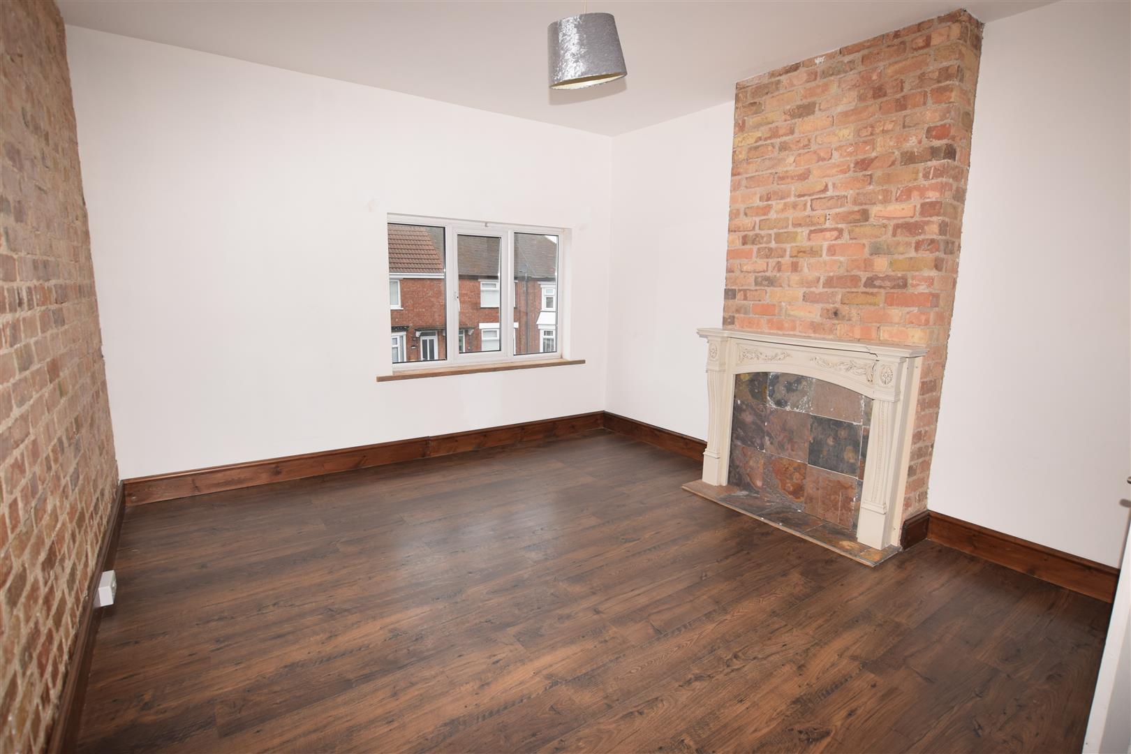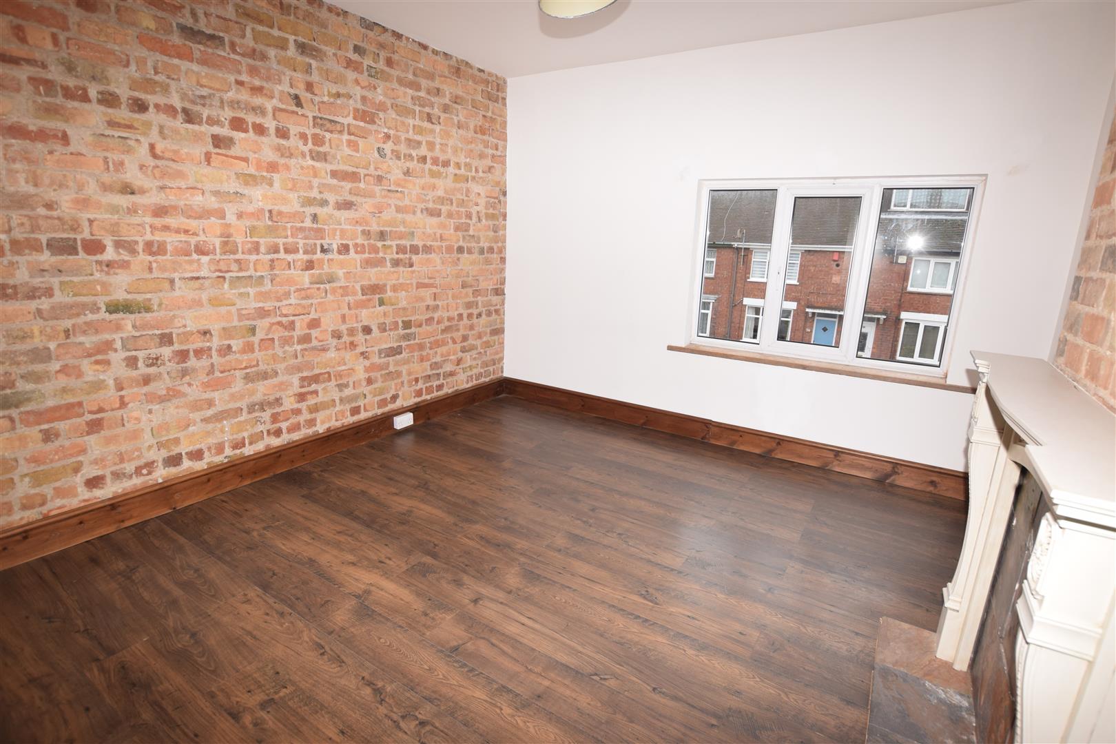 Double glazed window to front aspect. Exposed brick feature wall & chimney breast with ornate/decorative fireplace. Built in shelved cupboard. Central heating radiator. Wood effect laminate flooring.