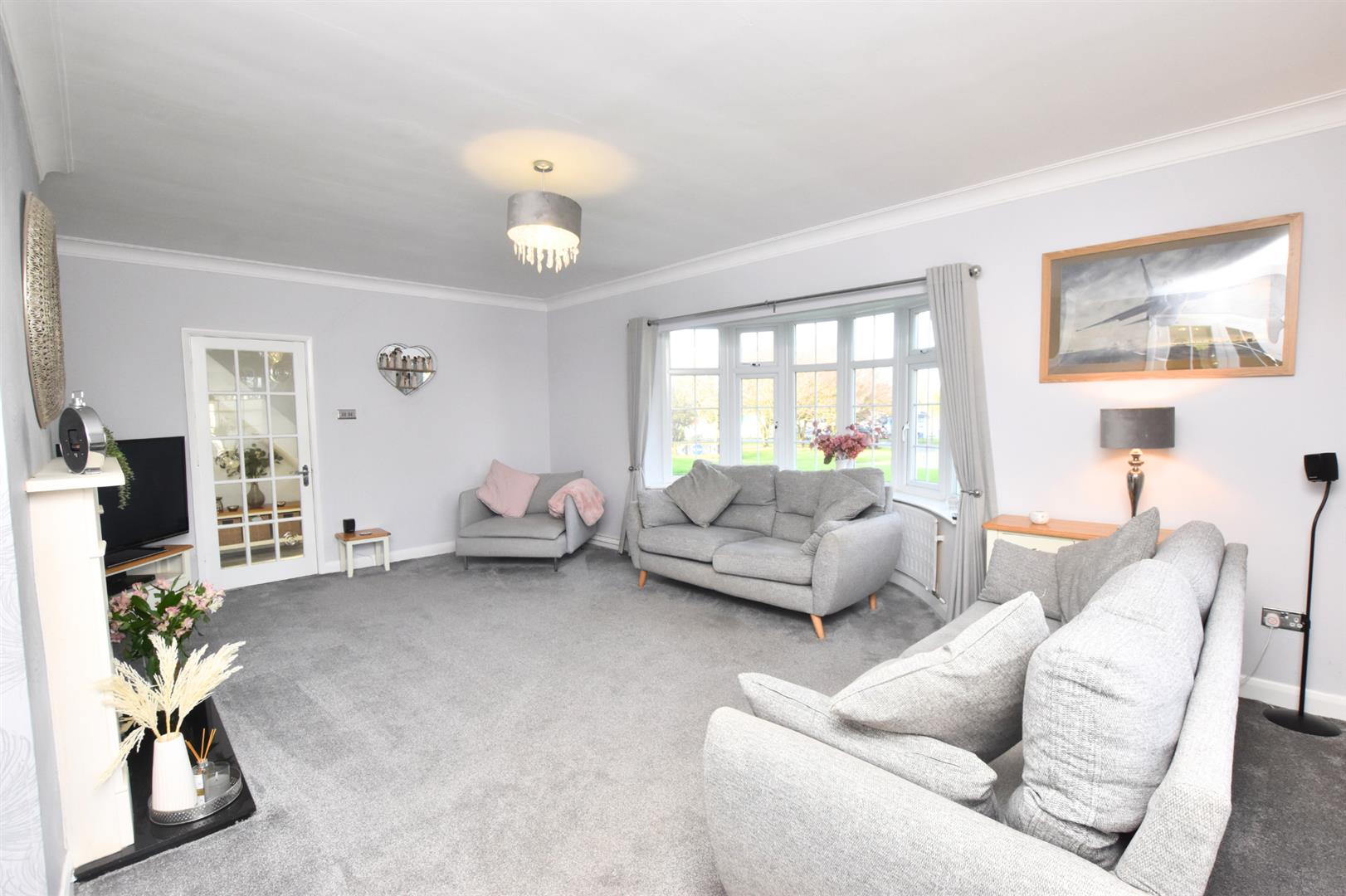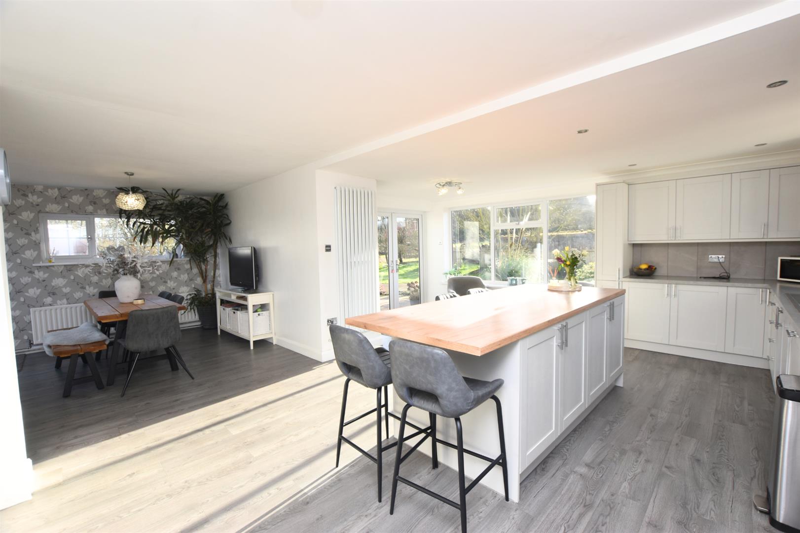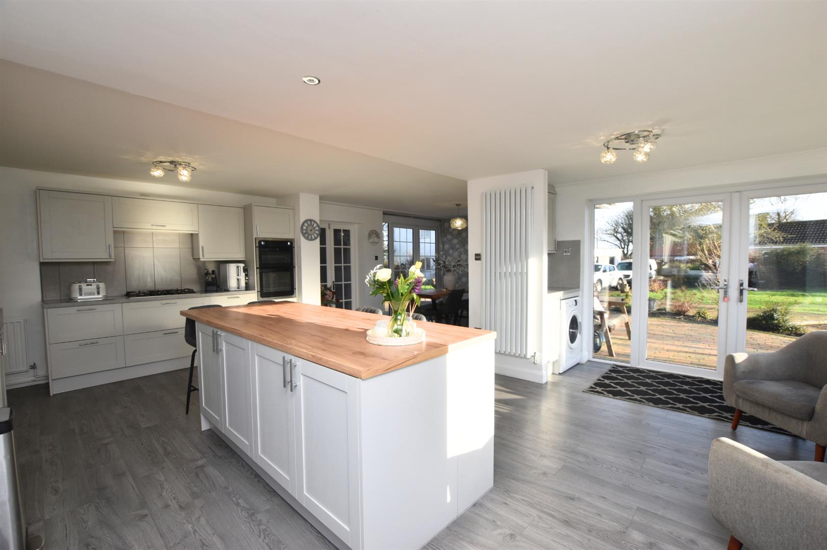 The lovely extended living dining kitchen is the hub of the property and has views towards open countryside to the west, two sets of french doors plus double glazed windows allows an abundance of nature sun light during the summer months. The room has a striking grey laminate flooring, coving to ceiling and three radiators one being a contemporary styled vertical radiator. The kitchen is fitted with a superb range of grey base and wall units incorporating an integrated fridge, freezer and dishwasher together with a built in gas oven, a 5 ring gas hob with an extractor fan above. The contrasting work surfaces are inset with a resin sink unit and have large grey tiled splash backs above. Inset spot lights to the kitchen area ceiling. To the complete the kitchen is a substantial matching island unit which also incorporates a useful breakfast bar area. which also provides a natural divide between the kitchen and dining and seating areas. With views over the garden is a small seating area and to complete this fabulous open space is a dining area with space for a table and chairs.